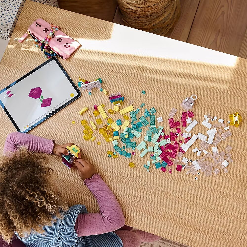 Kids begin by building heart, ghost, mermaid, star and unicorn toys. As their building confidence grows, they move onto a spaceship, cloud, shooting star, bird, narwhal, ice cream and flower. Next, they can scale up the creative fun with a large castle and dragon toy. Translucent bricks, eye and mouth pieces and hanger-bricks for display add see-through sparkle and extra creative fun to kids creations. Colorful, translucent building bricks Magical Transparent Box is a LEGO brick-build, play-and-display set for creative kids, packed with fun and fantasy models for girls and boys aged 5 and up Creative building set Translucent bricks, eye and mouth pieces and hanger-bricks for display add see-through sparkle and extra creative fun to kids creations Bursting with play value Kids build a heart, ghost, mermaid, star, unicorn, spaceship, cloud, shooting star, bird, narwhal, ice cream and flower toys, plus imaginative ideas of their own Many ways to play and display 4 hanging-brick elements let kids decorate their rooms and homes with fun toys, fantasy creatures and many other creations Gift for ages 5 and up This endlessly versatile toy is a colorful and creative treat designed to inspire kids imaginations for years to come Expand the fun Check out the full range of LEGO Classic toys (sold separately) for more hands-on imaginative play Bricks that build skills LEGO Classic toys are filled with ideas and inspiration and allow parents to share building fun and developmental milestones with their kids 340-piece set The unicorn toy measures over 3 in. (8 cm) wide, the mermaid toy stands over 3 in. (8 cm) tall and the ghost stands over 2.5 in. (6 cm) tall