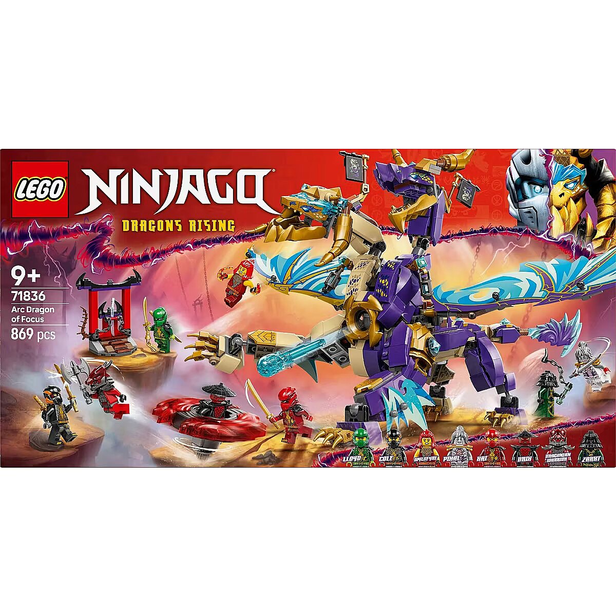 Description - Delight boys and girls aged 9 and up with this LEGO NINJAGO Arc Dragon of Focus (71836) ninja toy that lets them role-play epic action scenes from season 3 of the NINJAGO Dragons Rising TV show. This building kit features a 2-headed dragon figure with posable tail, legs, feet, head, neck, jaw and claws. Kids can activate a shooter in its chest and move its large foil wings back and forth using a lever on its back. This battle playset includes 8 NINJAGO character minifigures for ninja fans to stage action-packed adventures. Find ninja warriors Lloyd, Cole, Wyldfyre and Kai, and their ally Pixal, each with a ninja weapon accessory, plus villains Drix, Zarkt and a Dragonian Warrior with their own weapons. For more play value, the LEGO set comes with a cool spinjitzu spinner vehicle. Kids can place a minifigure inside and press a button on its launcher that fires it into a rapid spin, then watch as 2 power elements possibly fly off as it hits its target. NINJAGO dragon toy for kids The 2-headed Arc Dragon of Focus ninja toy lets boys and girls aged 9 and up play out action from season 3 of the NINJAGO Dragons Rising TV show Highly posable dragon figure The Arc Dragon of Focus action toy features a posable tail, legs, feet, head, neck, jaw and claws Interactive NINJAGO dragon Kids can activate a shooter in the dragons chest and move its large foil wings back and forth using a lever on its back 8 NINJAGO minifigures This LEGO building set comes with ninja warriors Lloyd, Cole, Wyldfyre and Kai, and their ally Pixal, plus villains Drix, Zarkt and a Dragonian Warrior Spinner toy A spinjitzu spinner vehicle is also included in this LEGO set, and kids can place a minifigure inside it and press a button on the launcher to fire it into a rapid spin Ninja gift idea for kids This LEGO  set provides a fun build-and-play experience and is a great gift idea for boys and girls aged 9 and up who have a passion for ninja action Bigger ninja adventures Look out for more LEGO NINJAGO toys (sets sold separately) featuring even more dragons, temples and vehicles A universe of LEGO NINJAGO toys This extensive collection of toy playsets (sold separately) lets kids escape into a fantasy world for imaginative play with their ninja heroes Measurements The Arc Dragon of Focus in this 869-piece LEGO NINJAGO building set for kids stands over 10.5 in. (27 cm) tall