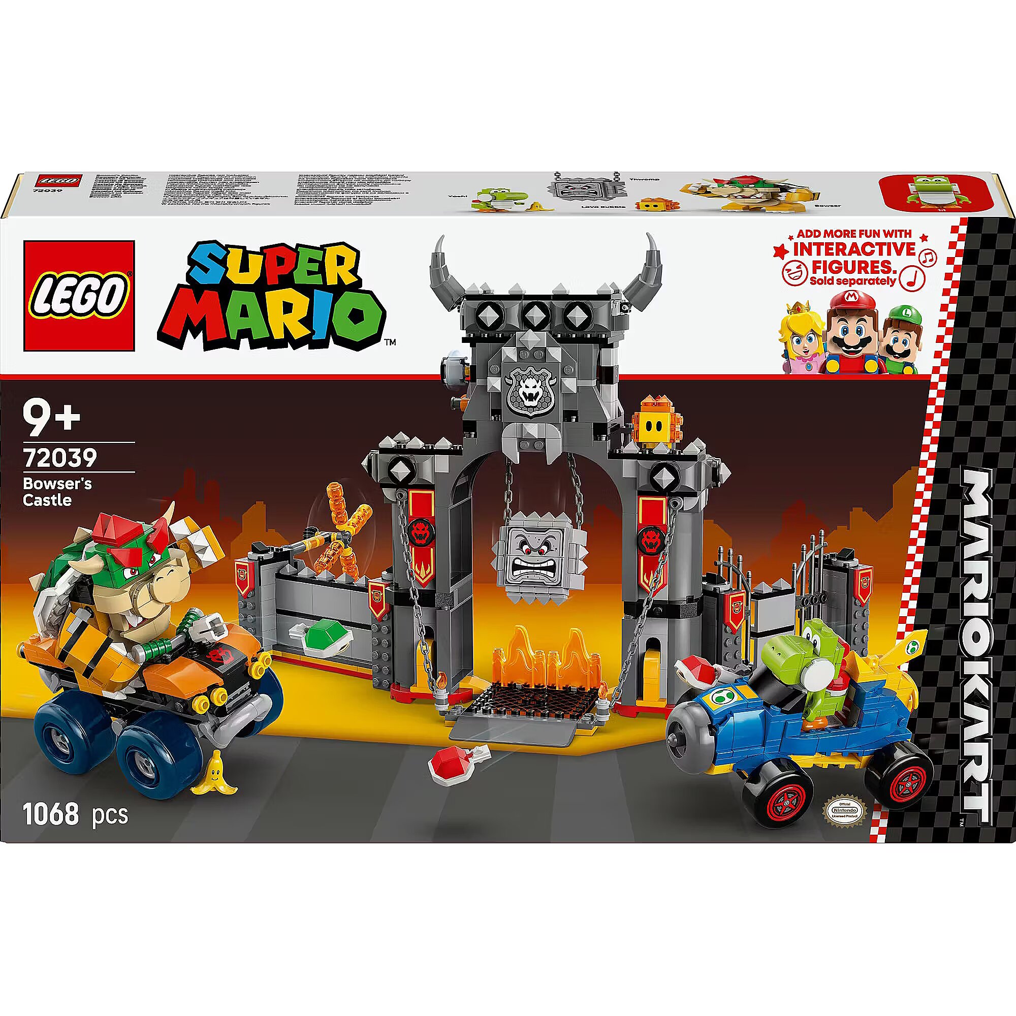 Description - LEGO Super Mario Mario Kart - Bowser and His Castle (72039) lets you organize thrilling races! This Nintendo-themed set makes a fantastic gift for boys, girls, and gamers aged nine and up. The set includes a castle with space for Bowser at the top, foldable walls, a spinning Fire Bar, and other exciting features. Race, drift, and launch shells with Bowser in his quad and Yoshi in the Mach 8 kart, break through the castle walls, dodge the falling Thwomp, and knock over Lava Bubble. The construction set includes four LEGO Super Mario figures: Bowser, Yoshi, Thwomp, and Lava Bubble. Add LEGO Mario, LEGO Luigi, or LEGO Peach (from sets 71439, 71440, 71441, or 72043 - sold separately) for interactive play, including Mario Kart-style sound and visual effects while racing. Explore the full range of LEGO Super Mario: Mario Kart sets (sold separately) to build more vehicles and characters to expand the fun. The set contains 1,068 pieces. Bowsers Castle - race Bowser against Yoshi, break walls, and avoid falling Thwomps with this LEGO Super Mario: Mario Kart set. Four LEGO Super Mario Figures - includes Bowser, Yoshi, Thwomp, and Lava Bubble, plus a banana element with a face. LEGO Super Mario Racetrack Set - launch shells from the quad and Mach 8 kart, race around (or through!) the castles foldable walls, avoid the spinning Fire Bar, and more. Interactive Play - place LEGO Mario, LEGO Luigi, or LEGO Peach (figures not included) in the vehicles to trigger Mario Kart-style sound and visual effects. Nintendo-Themed Gift for Gamers - perfect for boys, girls, and gamers aged nine and up. Interactive play requires sets 71439, 71440, 71441, or 72043 (sold separately). Endless Fun - explore the full range of LEGO Super Mario: Mario Kart sets (sold separately) to discover more vehicles and characters to race. Encourages Creativity - LEGO Super Mario sets offer interactive solo or group play, coin-collecting challenges, and the ability to expand and modify levels. Dimensions - Bowsers Castle in this 1,068-piece set measures 26 cm high, 36 cm wide, and 21 cm deep.