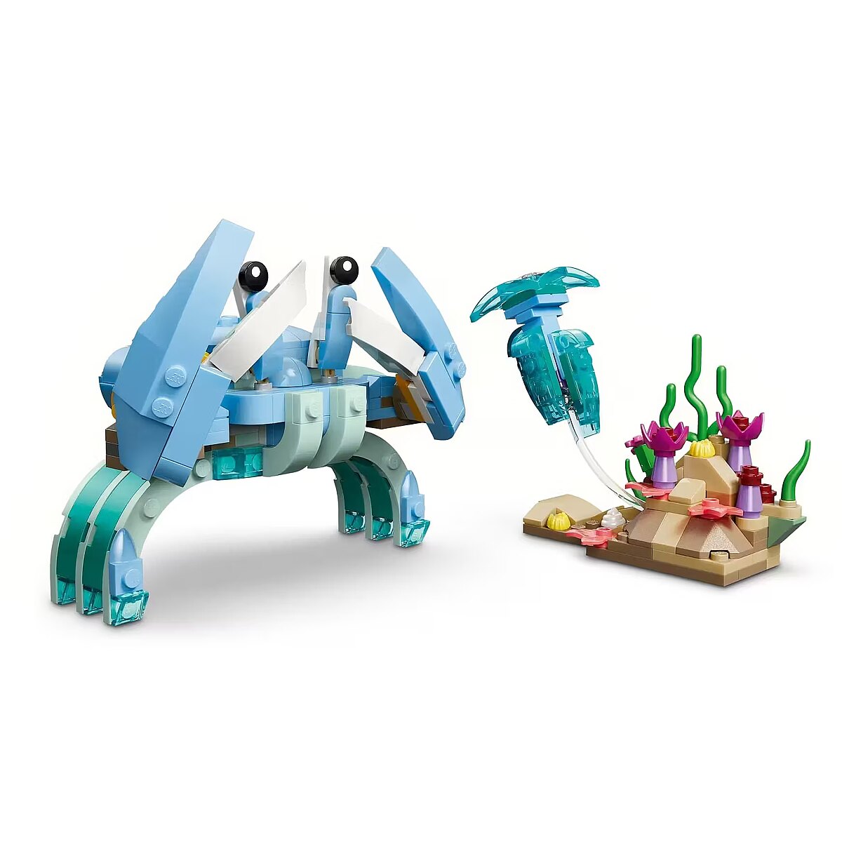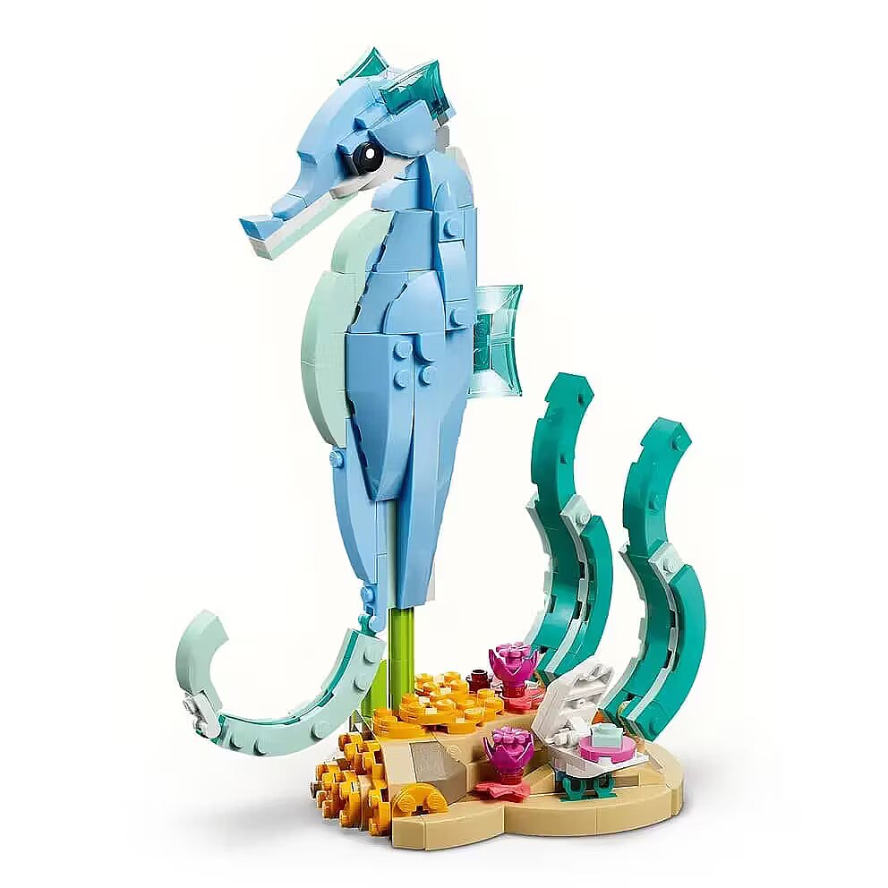 Description - Blocks Creator 31385 Sea Animals: Beautiful Dolphins The LEGO Creator 3in1 Sea Animals: Beautiful Dolphin (31385) building set lets children aged nine and up act out exciting stories. This toy for girls and boys offers three different building options using the same set of bricks. They can choose to build a dynamic, articulated model of an adult dolphin and its calf swimming on a wave above a coral reef. Then they can rebuild it into a movable seahorse on a colorful base with seaweed and a movable clam, or into a crab with sea plants and a jellyfish. When playtime is over, each of these beautiful figures can be proudly displayed as a decoration on a shelf or desk. This LEGO Creator 3in1 set will spark young imaginations and makes a perfect gift for children who love sea animals. Kids can build with confidence using the LEGO Builder app, where they can zoom in on models, rotate them in 3D, and track their progress with simple digital instructions. The models cannot be built simultaneously. The set consists of 542 pieces.