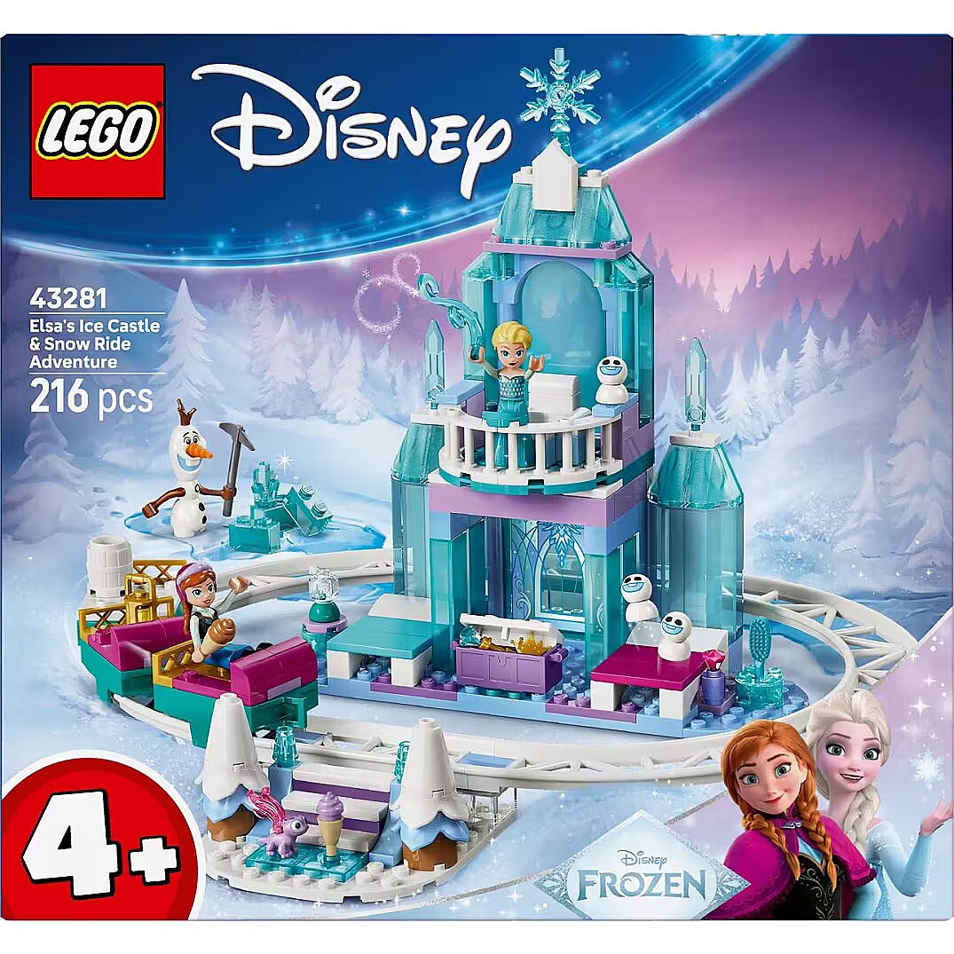 Description - Blocks Disney 43281 Elsas Ice Castle & Snow Ride Adventure Give kids aged four and up the LEGO Disney Elsa's Ice Castle and Snow Ride (43281). Seven LEGO Disney Frozen characters: Elsa, Anna, Olaf, Bruni, and three snowmen, will add to the fun. This set features a two-story castle with a throne room, balcony, two beds, and a kitchen. There's also a separate track with stairs and three sleighs for all the characters to ride.