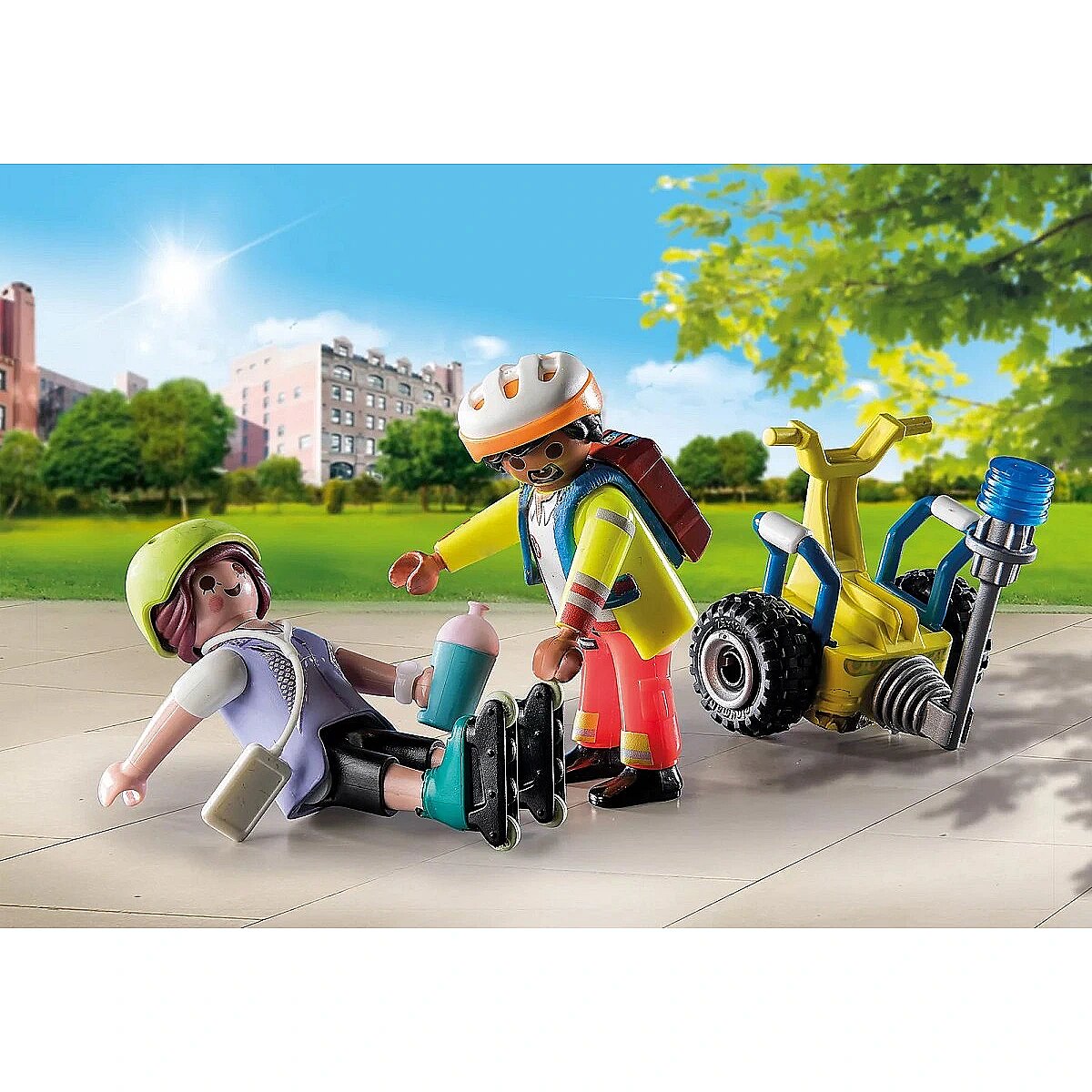 Description - The paramedic rushes to the aid of the inline skater. Rush to the rescue with the Balance Racer Starter Pack from PLAYMOBIL. An inline skater has fallen in the park and can no longer get up. Immediately the helpful paramedic comes to the rescue. Thanks to his agile balance racer, he is also fast on narrow paths. As soon as he reaches the injured person, he takes care of the first aid. Then it's off to the hospital for further examination. A great play experience for children aged 4 and up. The toy set includes two PLAYMOBIL figures, a balance racer, a backpack, rollerblades, wristwatch and other accessories for imaginative role play. With the various bandage labels, the injured figure can be doctored as desired. The roller skates of the female figure are removable. PLAYMOBIL Starter Packs take you right into the middle of the colorful PLAYMOBIL universe. The sets contain play figures and accessories for popular PLAYMOBIL worlds, are quick to assemble and ready to play straight away.