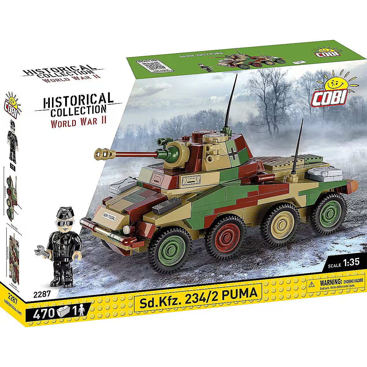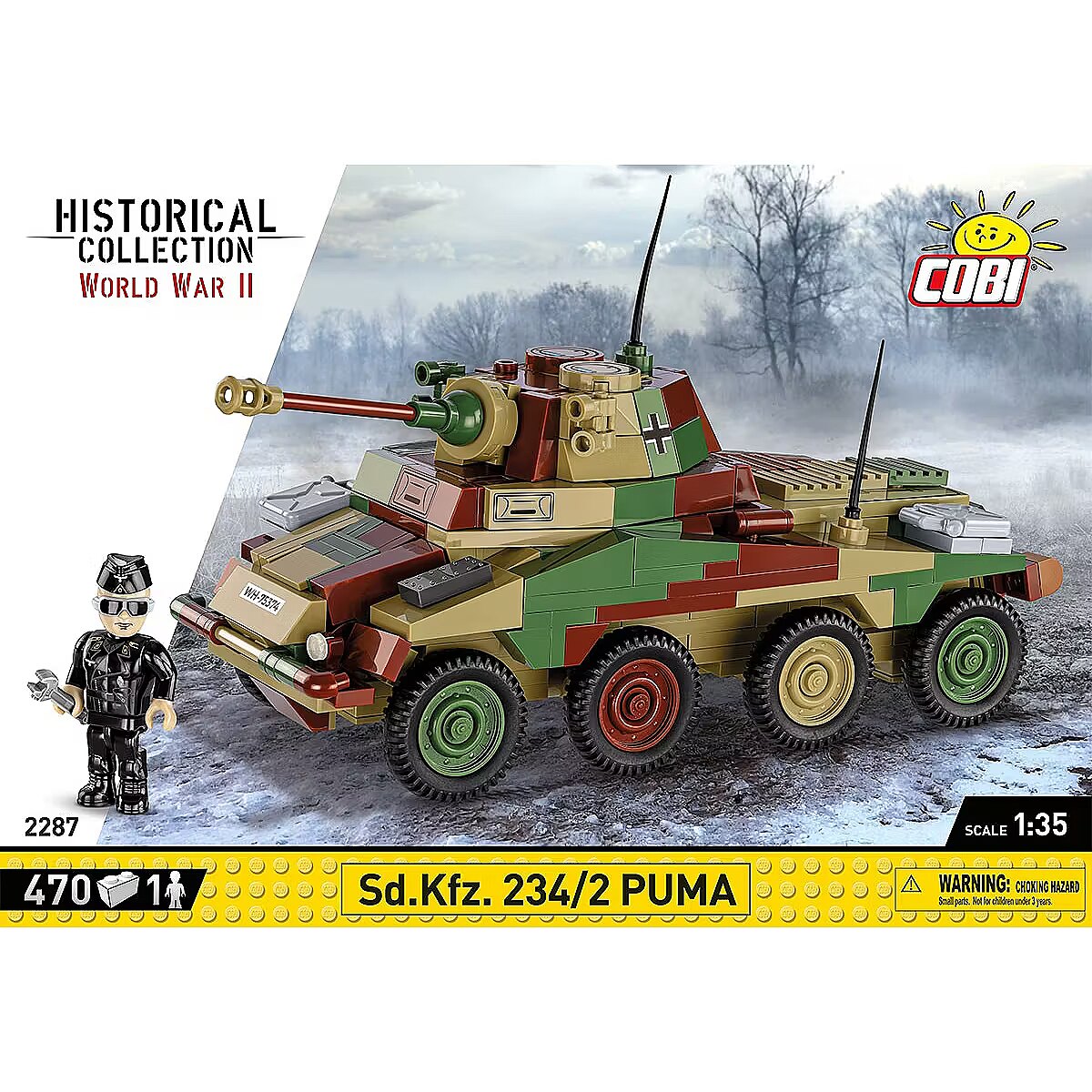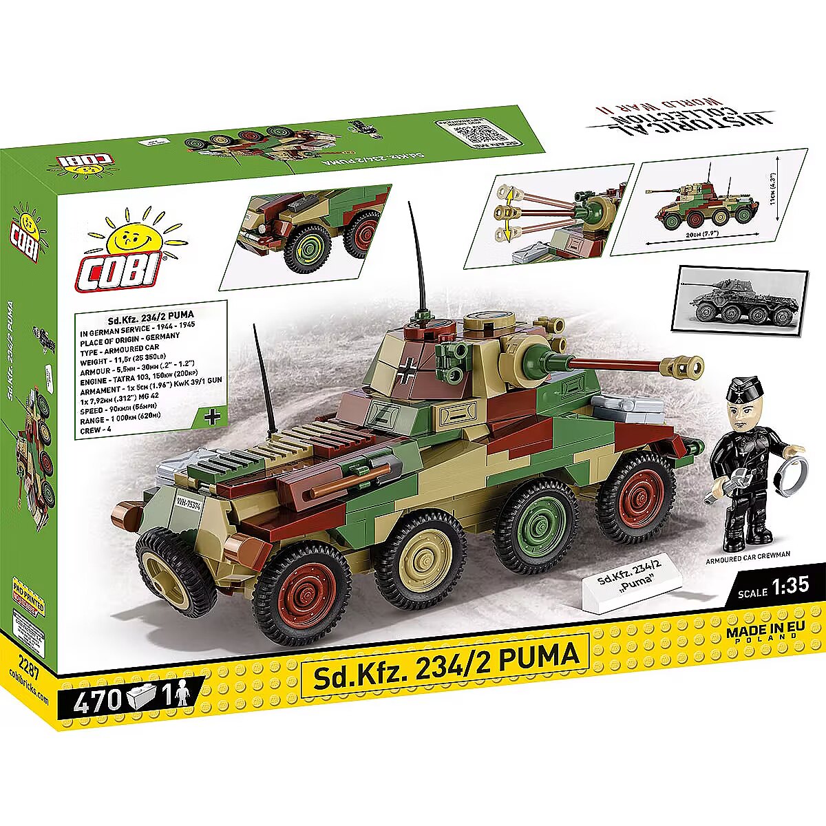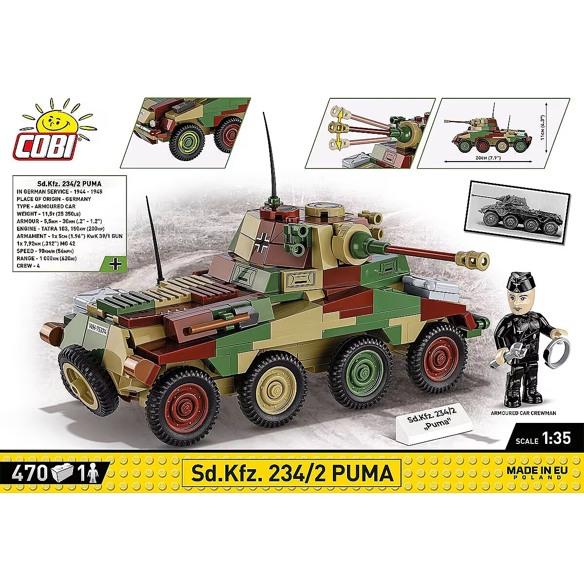 Description - We designed the block model of the German heavy armored car Sd.Kfz 234/2 PUMA in the scale of 1:35 using 470 elements. Once built, the vehicle is 20cm long and its size fits both the figures and other vehicles we create in this scale. The vehicle impresses with its very detailed design, camouflage and high-quality prints, which make it a very important entry in the COBI Historical Collection. There are no stickers here, we only use permanent prints. The vehicle has movable elements like wheels, the turret and the cannon. The set also includes a figure depicting a crew member of the armored car. The entire set is complemented by a plate with the vehicle's name on it. The set is a must-have not only for young history enthusiasts, but above all for adult collectors and fans of military technology. Build history, piece by piece, with COBI! Sd. Kfz. The 234/2 Puma was a German armored wheeled vehicle used during World War II. It was equipped with a 50mm cannon placed in a fully armored turret. From September 1943 to September 1944, 101 of these vehicles were produced. The car had a Tatra 103 diesel engine and an impressive maximum speed of up to 90 km/h. Off-road, it performed almost as well as tracked vehicles. 470 high-quality elements Manufactured in the EU by a company with over 20 years of tradition The blocks meet the safety standards of products for children Fully compatible with other brands of construction blocks Blocks with prints do not scratch or smear and do not fade during play or under the influence of temperature Clear and intuitive instructions based on illustrations and step-by-step directions 100% prints, no stickers Soldier figure Historical prints Nameplate Model dimensions (L x H): 20 cm (7.9") x 11 cm (4.3")