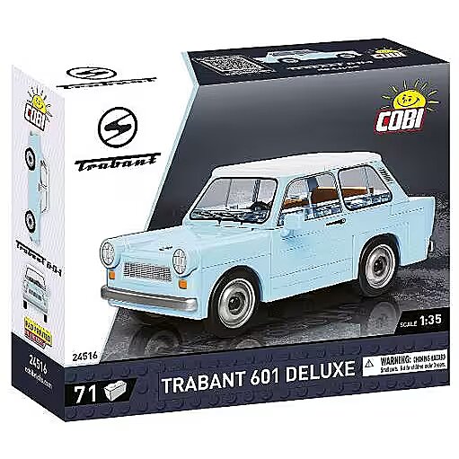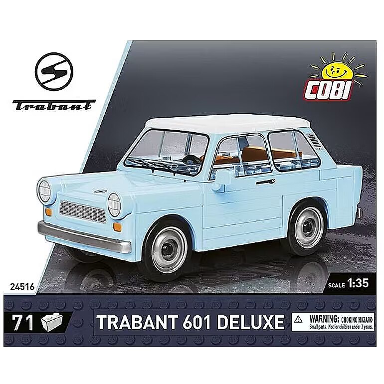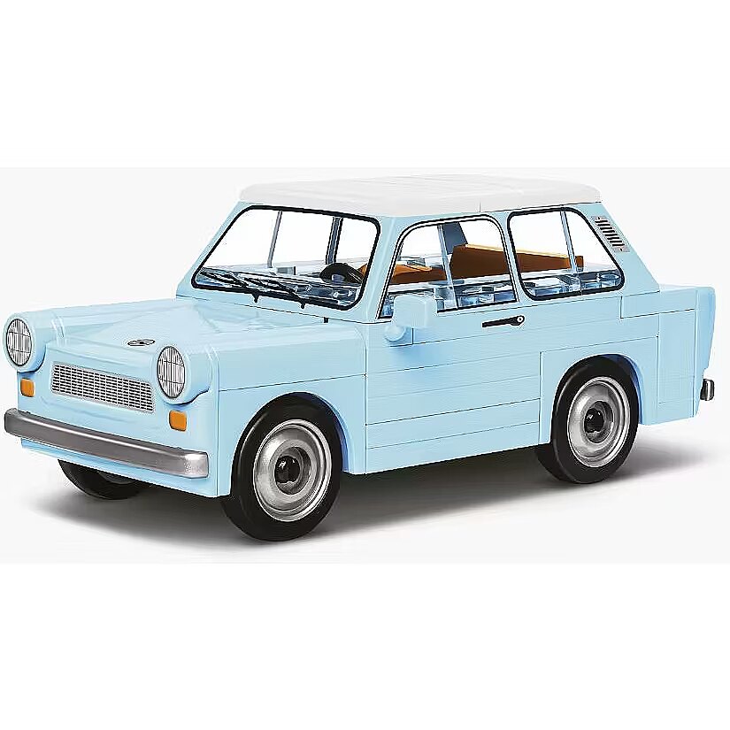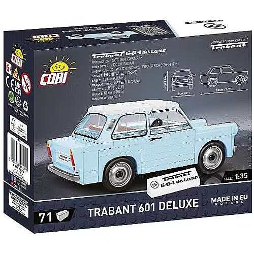 Description - The 1:35 scale model consists of 72 COBI construction blocks and very faithfully reproduces the characteristic shape of the original Trabant 601. The car was also developed in the new light blue color of blocks, even closer to the iconic original! The car has rotating wheels with tires that are perfect for moving the model during playtime. Additionally, we have given up on stickers in our sets, they have been replaced with durable prints that do not wear off even during intense play. This block car is a set for both discerning collectors and young enthusiasts of classic cars! And thanks to simple and intuitive instructions, construction is simple and will not cause any problems for builders of any age! Trabant is a brand of passenger cars produced in the GDR at the VEB Sachsenring Automobilwerke plant in Zwickau. The 601 Model debuted on the market in 1964 and was produced until 1990. The De Luxe version was developed in 1967. Trabant cars featured several technically interesting solutions. These included a body made of a plastic material called Duroplast. It has a melting point similar to that of aluminum and increased the car's resistance to corrosion and crushing. Other noteworthy solutions include a small two-stroke engine, large windows and a relatively spacious interior. The car reached a dizzying speed, slightly exceeding 100km/h. The Trabant deserved to be called a cult car from the German Democratic Republic. To this day it remains an instantly recognizable and extremely popular classic among motoring enthusiasts. It has also become a permanent part of popular culture. 72 high-quality elements Produced in the EU by a company with over 20 years of tradition The blocks meet the safety standards of products for children Fully compatible with other brands of construction blocks Blocks with prints do not scratch or smear and do not fade during play or under the influence of temperature Clear and intuitive instructions based on illustrations and step-by-step directions Modeling scale 1:35