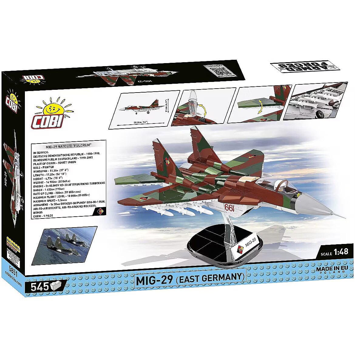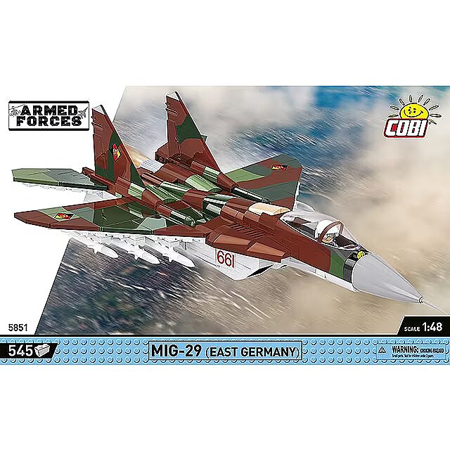 Description - MiG-29 (East Germany) The MiG-29 (NATO code: Fulcrum) is a Soviet, now Russian, modern front-line fighter aircraft, produced since 1983. East Germany used this type of aircraft since 1988. After German reunification, the MIG-29 fleet was maintained until 2002, when they were sold to Poland. The aircraft from the Armed Forces collection was developed in 1:48 scale and consists of 545 elements. Its size matches the rest of the modern fighter collection! The model contains completely new dedicated elements such as vertical stabilizers and a nose with a pitot tube. The set includes a plate with the model name and a display stand. The aircraft's landing gear can be easily detached to display it in flight on a block base with a transparent stem. Our block MIG-29 is 35.5 cm long and has a wingspan of 23 cm. Thanks to the intuitive instructions based on clear icons, construction is simple. This model is a must-have for all fans of aviation, militaria and military technology. The set was manufactured entirely in Poland within the European Union. This is another model of the iconic aircraft released as part of the intensively developing Armed Forces collection! 545 high-quality elements Manufactured in the EU by a company with over 20 years of tradition Meet safety standards for children's products Fully compatible with other brands of construction blocks Blocks with prints do not deform or fade during play or under the influence of temperature Clear and intuitive instructions based on drawings and icons 100% prints, no stickers Block display stand Plate with the name of the set