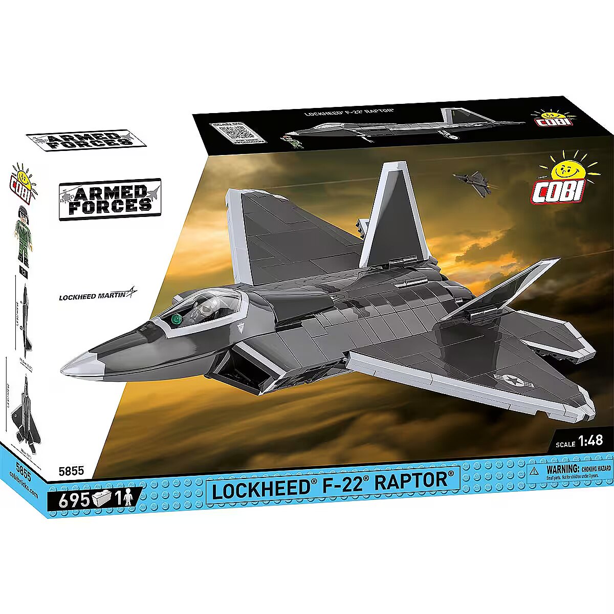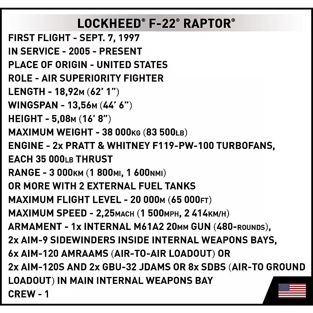 Description - LOCKHEED F-22 Raptor is an advanced fifth-generation multi-role fighter. This still somewhat mysterious and closely guarded aircraft was accepted into service with the United States Air Force and is subject to a total export ban to other countries. Thanks to the licensing agreement, COBI can produce the now legendary Raptor. The high-quality block model was designed in a scale of 1:48, matching the rest of the Armed Forces collection, which includes modern military equipment. The plane consists of 695 elements including prints. For this set, we have developed completely new elements characteristic of the F-22: the nose of the aircraft with the cabin and vertical stabilizers. The model is perfectly finished and smooth just like its real counterpart with STEALTH technology. The set includes an opening cabin in which you can place a detailed pilot figure wearing an oxygen mask. The plane's landing gear can also be easily dismantled to better display the model on the included display stand, which also includes a plate with the plane's name and the US flag printed on it. There are brick bombs in the opening hatch, as well. The detailed block model of the legend of the skies is a real treat for collectors and enthusiasts of military technology and block modeling. Thanks to the use of high-quality ABS and lightweight construction our model has the features of stealth technology and is undetectable to radars, just like the real thing. LOCKHEED F-22 Raptor is a very advanced fifth (newest) generation fighter in service with the United States Air Force. Work on it began in the 1980s. It was designed by the American corporation Lockheed Martin. The first flight took place in 1997, and it was officially accepted into service in 2005. The F-22 is characterized by advanced technologies that provide it with excellent maneuverability, radar stealth and the ability to conduct both air and ground operations. Its main task is air superiority. One of the key features of the F-22 is the so-called "supercruise" - the ability to maintain speed above sound without the need for additional fuel support. In addition, the aircraft is equipped with an advanced avionics system, the AN/APG-77 radar, and a unique radar cloaking system, which makes it difficult to detect by the enemy. 695 high-quality elements Produced in the EU by a company with over 20 years of tradition The blocks meet the safety standards of products for children Fully compatible with other brands of construction blocks Blocks with prints do not scratch or smear and do not fade during play or under the influence of temperature Clear and intuitive instructions based on illustrations and step-by-step directions 100% prints, no stickers Pilot figure