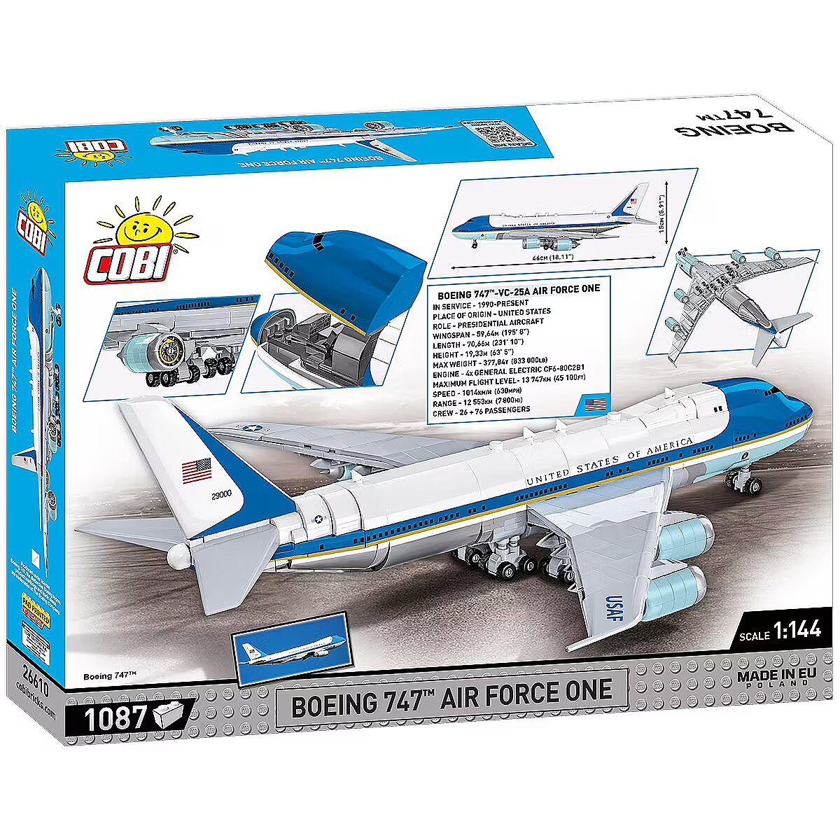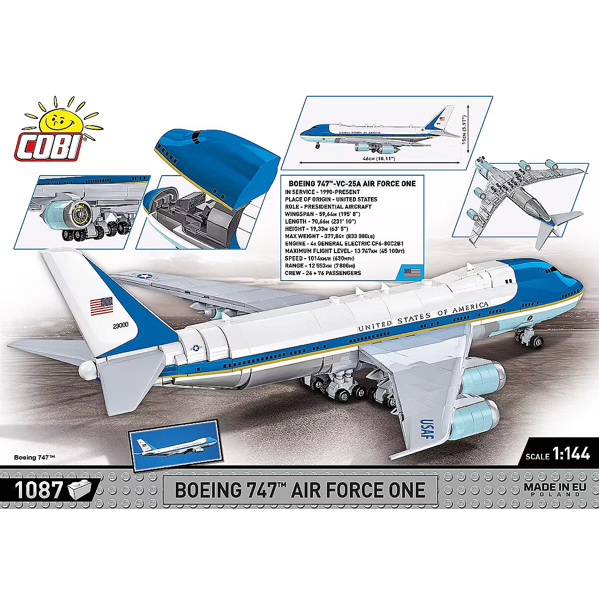 Description - Air Force One is the code name given to the US Air Force aircraft that carries the sitting President of the United States. The Boeing VC-25 is a military version of the Boeing 747 airliner, heavily modified for presidential transport and widely used by the United States Air Force (USAF) as Air Force One. The Air Force One crew consists of experienced pilots and cabin crew who are properly trained to operate this unique machine. The aircraft is capable of long-haul flights, ensuring the President of the United States can travel quickly and safely internationally and within the country. The block model of the most important Jumbo Jet in the world consists of 1,087 elements. The presidential plane was developed in a modeling scale of 1:144. Once built, the plane is 46cm long and has a wingspan of 42cm! The engines contain movable turbines that can be rotated. The very characteristic painting containing USAF markings and US national symbols has been reproduced in detail using high-quality prints. You won't find any stickers in this set! Specially designed elements make the model a delight not only for block modelers, but also aviation enthusiasts of all ages! Build your own Air Force One and feel the prestige of the President of the United States of America. 1087 high-quality elements Produced in the EU by a company with over 20 years of tradition The blocks meet the safety standards of products for children Fully compatible with other brands of construction blocks Blocks with prints do not scratch or smear and do not fade during play or under the influence of temperature Clear and intuitive instructions based on illustrations and step-by-step directions Moving elements