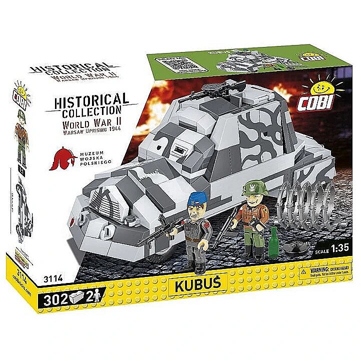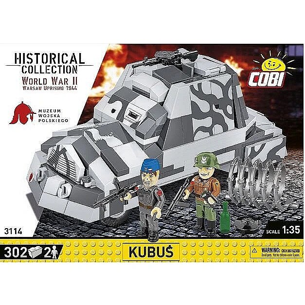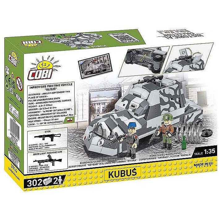 Description - Kubuś to polski improwizowany samochód pancerny, który został zbudowany przez powstańców warszawskich w sierpniu 1944 roku podczas Powstania Warszawskiego. Pojazd ten powstał w zaledwie kilka dni, w warsztacie przy ul. Tamka. Do jego budowy wykorzystano podwozie ciężarówki Chevrolet 157 oraz blachy stalowe, które miały chronić załogę przed ogniem nieprzyjaciela. Kubuś, uzbrojony w karabiny maszynowe, brał udział w kilku akcjach bojowych, w tym w nieudanym ataku na Uniwersytet Warszawski. Po zakończeniu powstania Kubuś cudem przetrwał wojnę i obecnie jest eksponowany w Muzeum Wojska Polskiego w Warszawie jako symbol odwagi i pomysłowości powstańców warszawskich! Razem z Muzeum Wojska Polskiego postanowiliśmy uczcić 80. rocznicę wybuchu Powstania Warszawskiego! Przygotowaliśmy wyjątkowy klockowy zestaw z legendarnym samochodem powstańczym Kubuś! Klockowy model w skali 1:35 zawiera nadruki oraz wszystkie najważniejsze cechy swojego pierwowzoru znajdującego się w Muzeum Wojska Polskiego w Warszawie. Nie zapomnieliśmy nawet o tak mało znanym detalu, jak emblemat Kolumny Motorowej Wydra, który znajdował się na zderzaku! Nasz model został wyposażony w karabin maszynowy DP-28. Górny właz można otworzyć, aby umieścić w nim figurkę. Nie każdy wie, że do Kubusia wsiadało się przez otwór w podłodze! Zaznaczyliśmy w modelu to nietypowe wejście! Do zestawu dołączone są dwie figurki przedstawiające powstańców warszawskich. W szarym kombinezonie, z biało-czerwoną opaską na prawym ramieniu, z naszywką Wydry na lewym i niebieskiej furażerce przedstawiliśmy żołnierza z Kolumny Motorowej Wydra, która była częścią Zgrupowania Krybar. Drugi z żołnierzy należy do plutonu Rafałki. To, co ich wyróżniało spośród innych formacji to używanie jako emblematów niemieckich saperskich żółtych trójkątnych proporczyków z trupią czaszką, które stanowiły oznaczenie dla terenu zaminowanego bądź skażonego chemicznie. Symbol ten znajduje się na lewym ramieniu żołnierza. Na hełmie z boku białą farbą namalowana jest litera R charakterystyczna dla tej formacji. Obie figurki zostały wyposażone w akcesoria takie jak: pistolet maszynowy STEN, ręczny karabin maszynowy Bren, granat ręczny i minę. W zestawie znajduje się również butelka oraz fragment drutu kolczastego. Powstanie warszawskie wybuchło 1 sierpnia 1944 roku i trwało aż do 3 października. Było zbrojnym wystąpieniem polskiego ruchu oporu, głównie Armii Krajowej, przeciwko okupującym Warszawę wojskom niemieckim. Celem powstania było wyzwolenie stolicy przed nadejściem Armii Czerwonej, aby zapewnić suwerenność Polski po wojnie. Mimo początkowych sukcesów, powstańcy nie zdołali utrzymać swoich pozycji w obliczu przeważających sił niemieckich i braku dostatecznej pomocy z zewnątrz. Po 63 dniach zaciętych walk powstanie zostało stłumione. Zginęło około 16 tysięcy powstańców i około 150-200 tysięcy cywilów, a miasto zostało niemal doszczętnie zniszczone. Powstanie warszawskie pozostaje symbolem polskiego heroizmu i patriotyzmu. 302 wysokiej jakości elementy Wyprodukowane w UE przez firmę z ponad 20-letnią tradycją Spełniają normy bezpieczeństwa dotyczące produktów dla dzieci W pełni kompatybilne z innymi markami klocków konstrukcyjnych Klocki z nadrukami nie odkształcają się i nie bledną w czasie zabawy czy pod wpływem temperatury Model samochodu pancernego Dwie figurki Akcesoria.