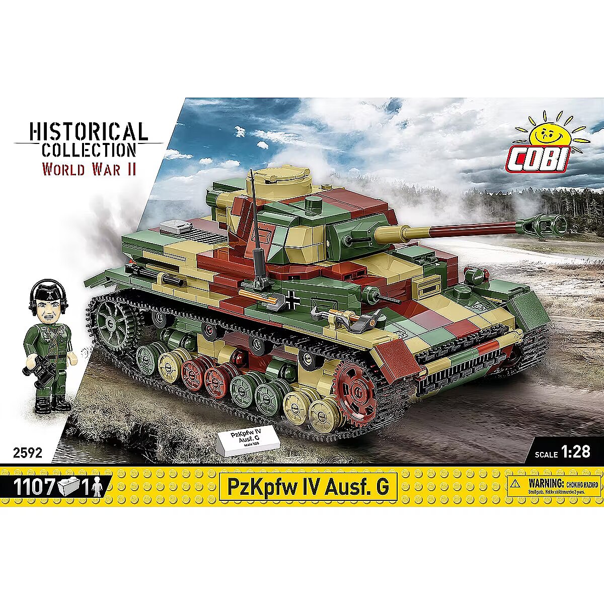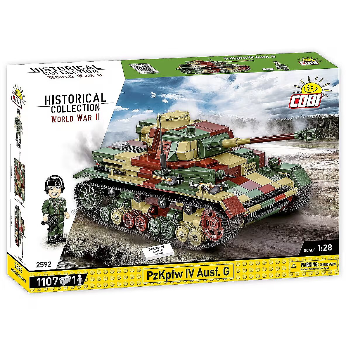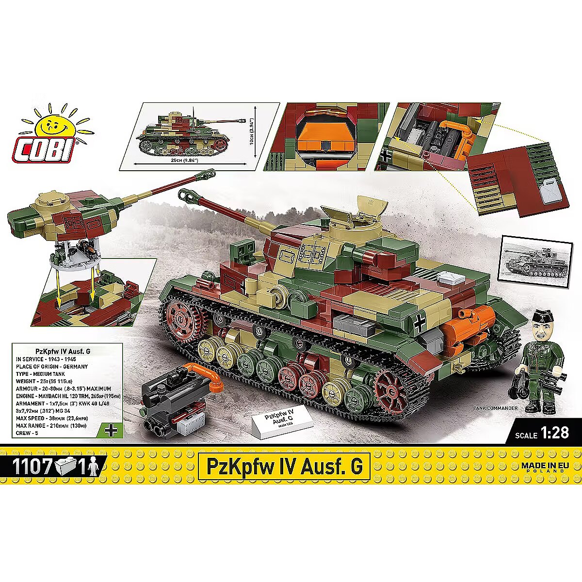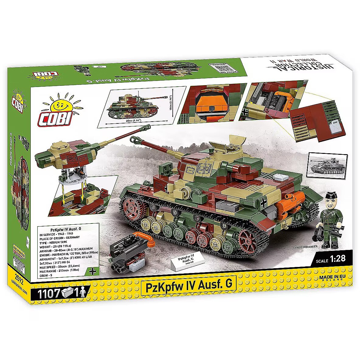 Description - Klocki WWII PZKPFW IV AUSF.G 1107 klocków Czołg Panzerkampfwagen IV był jednym z najważniejszych niemieckich czołgów podczas II wojny światowej. Klockowy Pazner IV składa się z 1107 elementów i jest zaprojektowany w skali 1:28. Klocki zawierają wysokiej jakości nadruki, które nie ścierają się w trakcie zabawy. Kolorowy kamuflaż jest charakterystyczny dla końcowego okresu wojny. Model posiada otwierany właz, w którym można umieścić figurkę czołgisty. Wieża obraca się w zakresie 360 stopni, lufa armaty ma możliwość ruchu w kierunku góra/dół. Wieżę wraz z koszem można odczepić od zestawu i podziwiać wnętrze pojazdu. Pod klapą serwisową znajduje się klockowy silnik, który może być również eksponowany obok modelu. Trakcja gąsienicowa pracuje w trakcie poruszania czołgiem za pomocą ręki. W komplecie znajduje się figurka czołgisty w furażerce i słuchawkach oraz tabliczka z nadrukowaną nazwą pojazdu. Zbuduj historyczny czołg Panzer IV z drugiej wojny światowej i odkryj niesamowite detale!