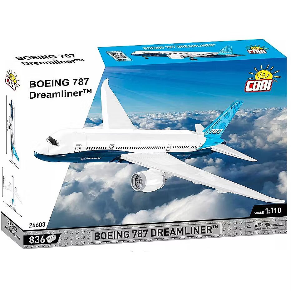 Description - The Boeing 787 Dreamliner is the latest model of passenger aircraft produced by the American aviation company Boeing Company. It is a medium-sized, wide-body, long-haul airliner. The Boeing 787 entered service in 2011. It carries from 210 to 330 passengers, depending on the seating configuration. The plane is supposed to be more economical when it comes to fuel consumption. In addition, it became the first passenger aircraft in which the fuselage and wings were made almost entirely of composite materials. The Dreamliner has entered service with many airlines around the world. It is also used by LOT Polish Airlines, where it flies on the longest routes. The model of the latest passenger plane Boeing 787-8 Dreamliner has been faithfully reproduced from 836 COBI construction blocks. Being designed in the 1:110 scale allows the set to faithfully reflect the shape of the original. The aircraft is equipped with rotating wheels and a folding landing gear. Engines with rotating rotors are mounted under the realistic wings. The set uses only permanent prints. There are no stickers here! The Dreamliner from COBI is the perfect set for all fans of civil aviation, technology and building with construction blocks. Thanks to faithfully reproduced details it will delight adult collectors, teenagers and young flying enthusiasts, alike! 836 high-quality elements Produced in the EU by a company with over 20 years of tradition The blocks meet the safety standards of products for children Fully compatible with other brands of construction blocks Blocks with prints do not scratch or smear and do not fade during play or under the influence of temperature Clear and intuitive instructions based on illustrations and step-by-step directions Pilot and passenger figure Moving elements