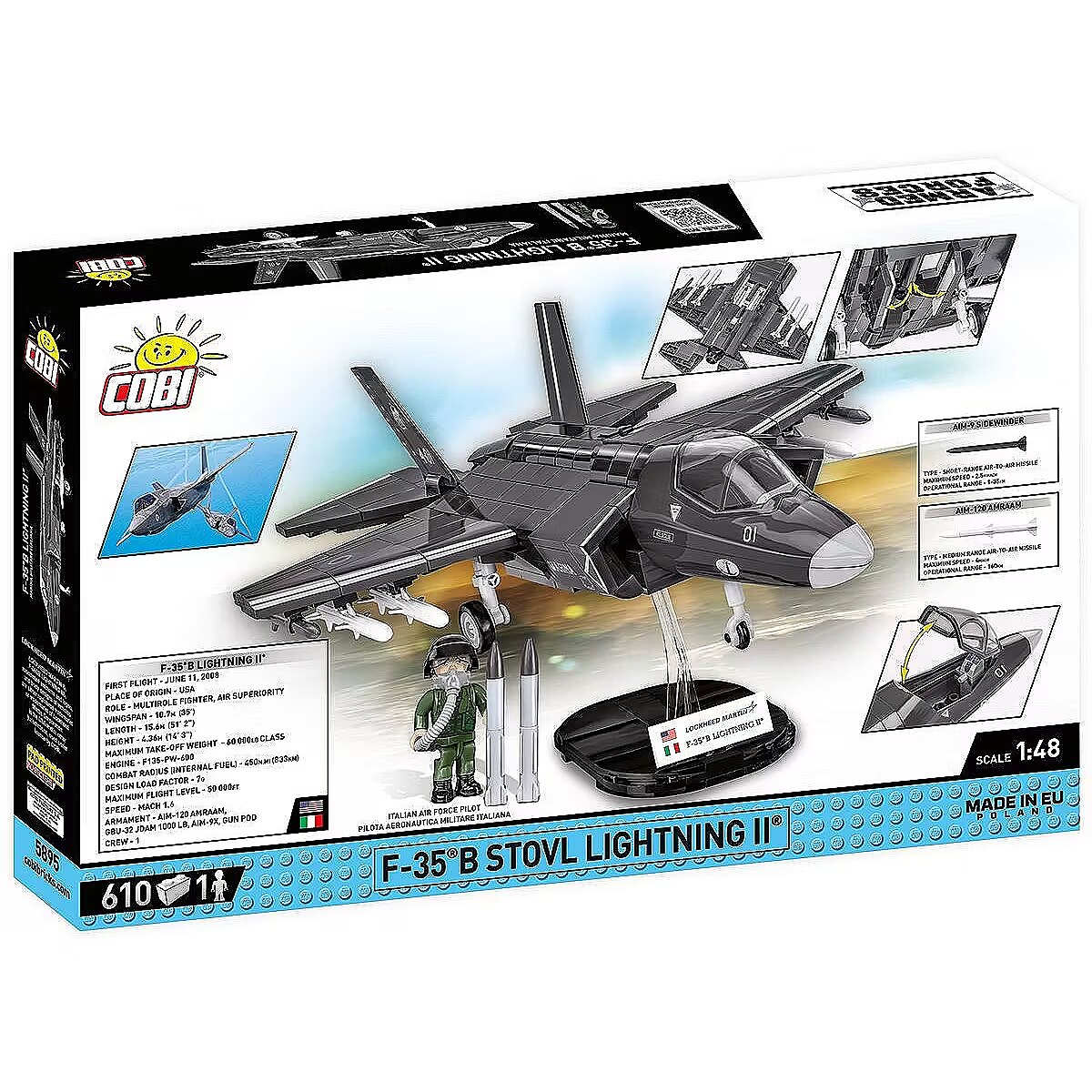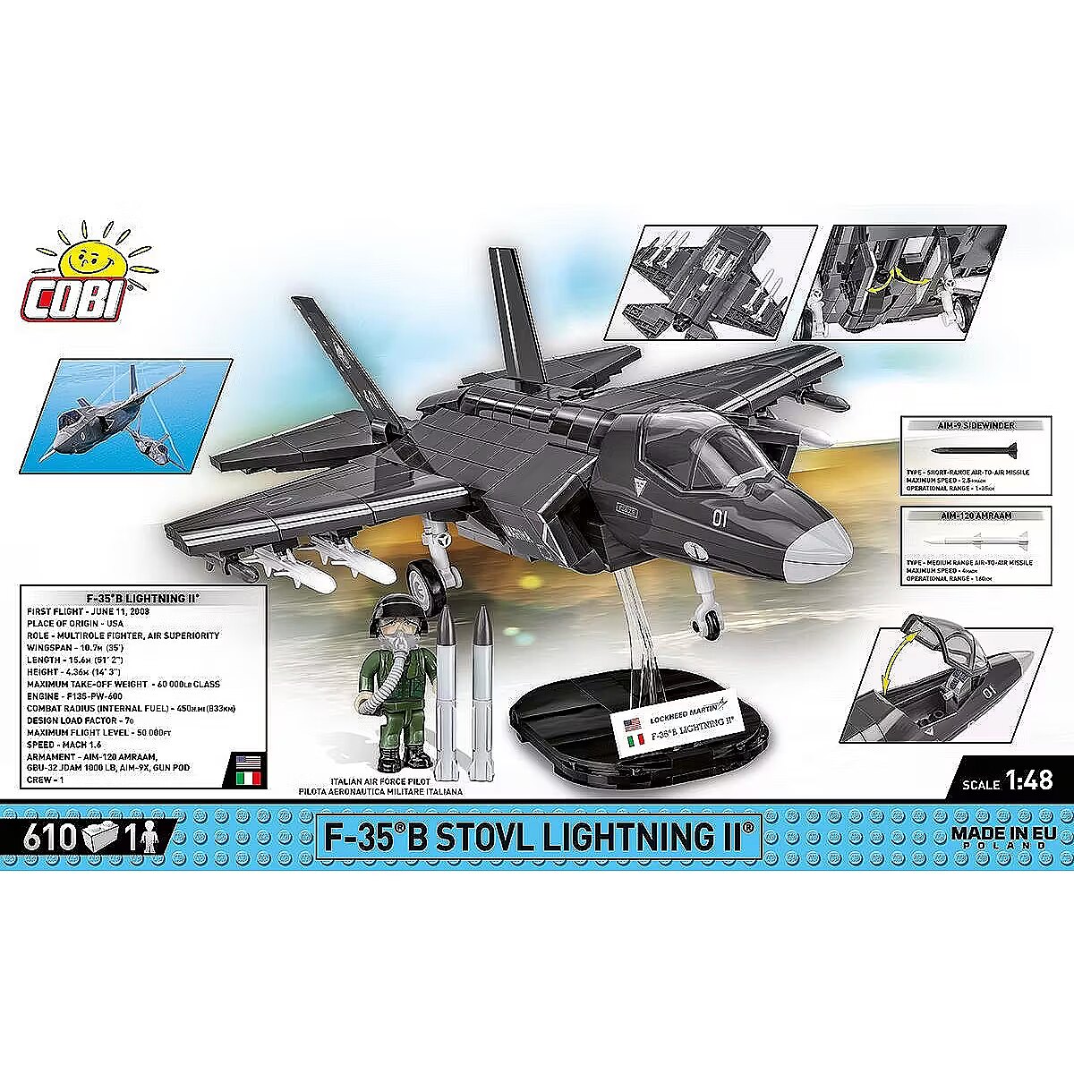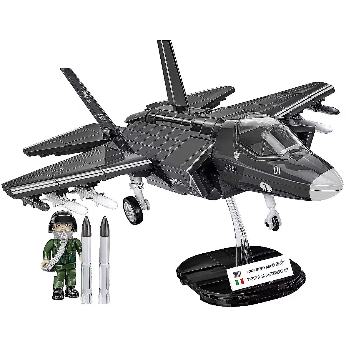 Description - Klocki F-35B Stovl Lightning II 610 klocków F-35B LIGHTNING II to jednomiejscowy, wielozadaniowy myśliwiec zaprojektowany przez korporację Lockheed Martin. Włochy są jednym z państw europejskich, które posiadają myśliwce wielozadaniowe F-35B, czyli wersję skróconego startu i pionowego lądowania. Pierwsze maszyny F-35B zostały dostarczone do Włoch w 2018 roku. Obecnie te myśliwce służą zarówno w lotnictwie Włoskiej Marynarki Wojennej (Marina Militare), jak i w Włoskich Siłach Powietrznych (Aeronautica Militare).
