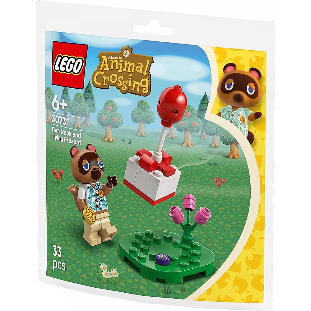 Description - Bricks Animal Crossing 30731 Tom Nook and the flying gift Fans of the Animal Crossing video game series can now join Tom Nook - with a Bell coin in hand - search for a fossil, then pop a gift balloon to reveal a surprise: a DIY recipe card.