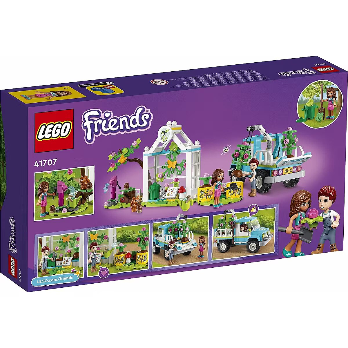 Technical_details - 41707 Friends tree planting vehicle construction toy Spark an interest in the great outdoors with LEGO Friends 41707 Tree Planting Vehicle for kids aged 6+. Boys and girls can have fun learning how plants grow with this great value plant and flower garden toy for ages 6+, which includes 2 mini dolls (Olivia and Daniel), a tree nursery and a wheeled toy pickup truck. There are also lots of cute gardening accessories and plenty of animal figures to keep the LEGO Friends characters company at work. This LEGO Friends set is packed with features to encourage imaginative play. Little car fans will love the toy pickup truck, which the characters have converted into an electric truck. It has a movable gripper arm to raise and lower the trees into the pickup. The cabin has room for both mini dolls - kids can just take the roof off and put them inside. Let little LEGO builders discover the world of Heartlake City. Whether kids are interested in science, sports, art or the environment, they're sure to find a set that stimulates their imagination and a character just like them. The LEGO Friends nature toys bring children closer to nature and make great gifts for a birthday or any other occasion for children aged 6 and over. Type: construction toy EAN code: 5702017155081 Manufacturer No.: 41707 Series: Friends Parts: 336 pieces Age recommendation: from 6 years Target group: school children, young people Material: Plastic Warnings: Caution: Not suitable for children under 36 months! Warnings: Attention: Danger of suffocation due to small parts! Dimension: Width: 60mm x Height: 70mm x Depth/Length: 140mm