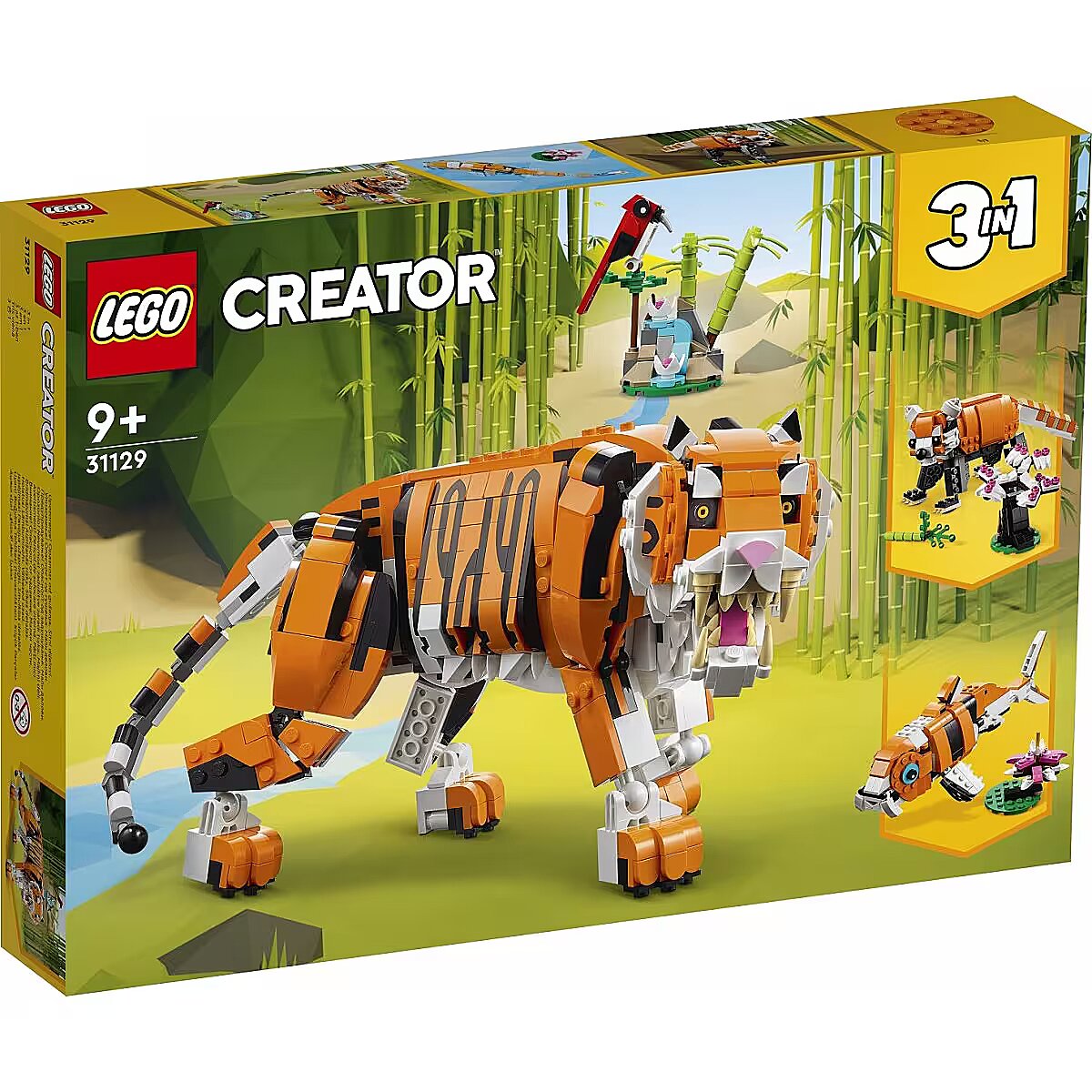 Technical_details - 31129 Creator Majestic Tiger construction toy LEGO Creator 3in1 Majestic Tiger (31129) is an ingenious construction toy that inspires fun stories for little animal lovers aged 9 and up. It features a LEGO brick toy tiger that can move its tail, legs, body, shoulders, head and jaw, and change its facial expression. With this amazing 3in1 set from LEGO Creator, children have at least 3 different build-and-play experiences at their disposal for endless creative adventures. Kids can build a toy tiger with a red bird, then transform it into a posable red panda with bamboo and a bonsai tree, which rebuilds into a toy koi with a posable tail and flippers, plus water lilies. Alternatively, they can let their imagination run wild and create a completely different animal! This 3-in-1 animal figure set for kids comes with interactive digital building instructions for even more building fun. The free LEGO Building Instructions app for smartphones and tablets includes zoom and rotate tools to help children visualize the model as they build. This exciting 3-in-1 LEGO Creator construction toy, featuring a majestic tiger, makes a great birthday present or gift for any child. Type: construction toy EAN code: 5702017151854 Manufacturer part number: 31129 Series: Creator Parts: 755 pieces Age recommendation: from 9 years Target group: school children, young people Material: Plastic Warnings: Caution: Not suitable for children under 36 months! Warnings: Attention: Danger of suffocation due to small parts! Dimension: Width: 70mm x Height: 140mm x Depth/Length: 330mm