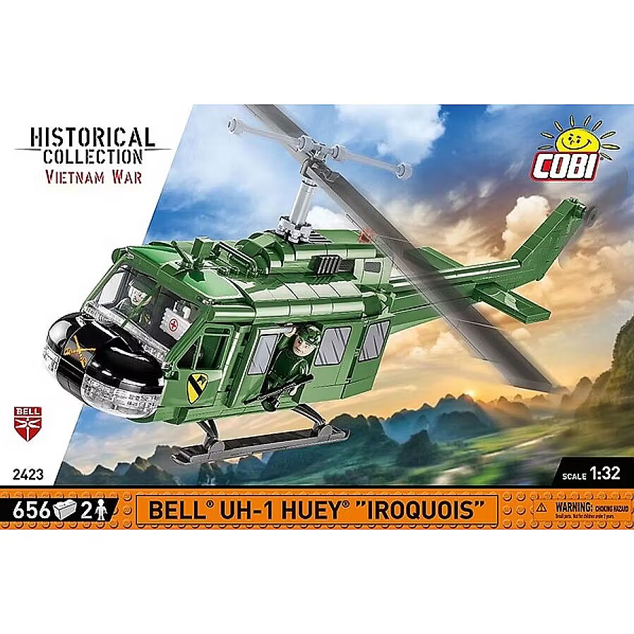 Description - The Bell UH-1 Huey is a multi-role American helicopter that entered service in 1957. It is widely known from the Vietnam War where it served as a transport, air support and medical helicopter. Many types of weapons were mounted on the helicopter including a machine gun on the transport sides, and in the support version 70 mm unguided missile pods and the M134 Minigun rifles. 12 soldiers could board the helicopter. The Executive Edition is an expanded version of the most iconic US Army combat helicopter of all time. The helicopter received additional on-board armament and additional prints on the propellers. The crew received two figures, available only in this set. AFN Radio DJ is a radio host from the official American Forces Network military radio station. The second character is an American soldier with a printed ammunition tape, armed with an M16 rifle and a combat knife. The entire Executive Edition set is complemented by a black block display stand with the printed name of the set and the BELL logo, available only in this edition. You can build the extremely popular American Huey helicopter, accurately reproduced in 1:32 scale, from a set of COBI construction blocks. The set was released in the Vietnam War series under the license of the American manufacturer of commercial and military helicopters Bell Helicopter Textron. Measuring 39 cm in length, the model has been covered with high-quality prints that do not wear off even during intensive use. The prints are characteristic of the US Air Cavalry and imitate the details of their equipment. The helicopter is equipped with rotating propellers, sliding doors and a machine gun inside. The set includes four figures: pilot, two soldiers and AFN Radio DJ. 756 high-quality blocks Produced in the EU by a company with over 20 years of tradition The blocks meet the safety standards of products for children Fully compatible with other brands of construction blocks Blocks with prints do not scratch or smear and do not fade during play or under the influence of temperature Clear and intuitive instructions based on illustrations and step-by-step directions 4 crew figures Display stand A plate with the printed name and the BELL logo