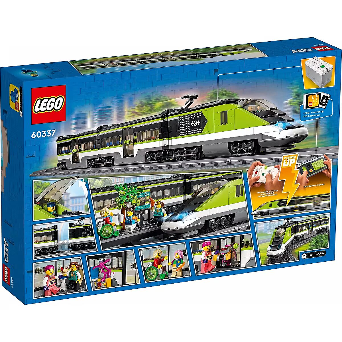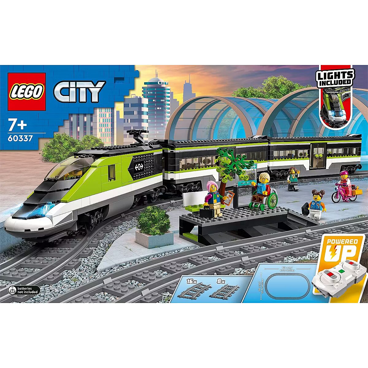 Technical_details - 60337 City passenger express train, construction toy Board everything! Here comes LEGO City Passenger Bullet Train (60337) with a remote-controlled train for ages 7+. The LEGO railway and train toy with working, dimmable headlights and LEGO powered-up technology will impress every child and train lover. This LEGO train set includes a dining car, passenger car, platform, 24 LEGO rails and 6 minifigures. There are also accessories such as a laptop, phone, bike with helmet, wheelchair, briefcase, backpack and toy hot dog for hours of train-themed role-play. The children can board the dining car, have a drink and something to eat during the journey, or they can board the passenger car, which has space for their luggage and bicycle. Once on board, they can take a seat at their favorite table and enjoy the ride! This great train toy comes with easy-to-understand building instructions for each model. Children aged 7+ can build independently or join forces with friends and family for group building and play. LEGO City playsets put kids right in the middle of the action with realistic vehicles, feature-rich structures and inspiring characters. Children learn about the world around them while playing stories and scenarios that depict life in a fun and engaging way. Type: construction toy EAN: 5702017162126 Manufacturer number: 60337 Series: City Parts: 764 pieces Content/Features: The LEGO train set includes a remote-controlled locomotive with working, dimmable headlights and LEGO power-up technology, a dining car, a passenger car, a platform, 24 LEGO rails and 6 minifigures: 4 passengers, train driver, restaurant worker, and bicycle and Helmet, wheelchair, briefcase, backpack and with a step-by-step guide. Age recommendation: from 7 years Target group: school children, young people Material: Plastic Lighting: yes Warnings: Caution: Not suitable for children under 36 months! Warnings: Attention: Danger of suffocation due to small parts! Feature: The train and its dimmable lights can be controlled with the remote control or a smart device connected to the LEGO Powered Up app Additional information: When set up, the passenger express train measures over 10 cm in height, 86 cm in length and 5 cm in width. Accessories: available | remote control Accessories: required | 10x LR03/AAA batteries Dimension: Width: 378mm x Height: 103mm x Depth/Length: 582mm Weight: 2.2kg
