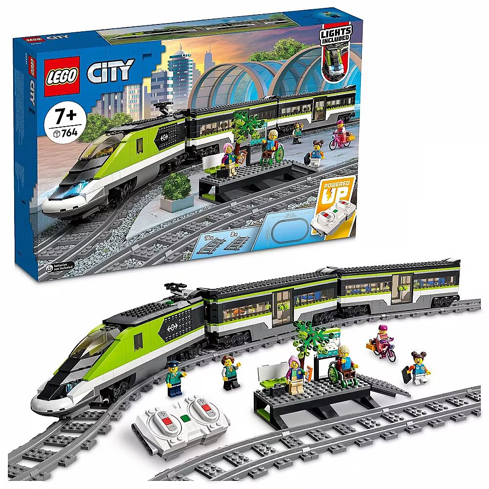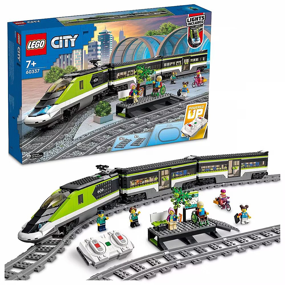 Description - The LEGO City Express Passenger Train set (60337) includes a remote-controlled bullet locomotive with working, dimmable headlights and LEGO Powered Up technology, a dining car, passenger car, station platform, 24 track pieces and 6 minifigures for endless hours of train-themed role play. Designed for kids and train enthusiasts This amazing buildable toy train set comes with an easy-to-follow building guide for each model. Kids aged 7+ can choose to build independently or join friends and family members for an awesome group build-and-play experience. More than just cool toys for kids LEGO City playsets take kids to the heart of the action with realistic vehicles, feature-rich structures and inspiring characters. Kids learn about the world around them as they play out stories and scenarios that depict life in a fun and exciting way. Toy train set for kids and train enthusiasts The LEGO City Express Passenger Train playset (60337) is packed with features and functions for endless hours of train-themed play Whats in the box? Includes all you need to build a bullet locomotive with working, dimmable headlights, a dining car, passenger car and station platform, plus 24 track pieces and 6 minifigures Features and functions The toy train and its dimmable headlights can be operated via the included remote control or a smart device equipped with the LEGO Powered Up app A gift for any occasion This LEGO City toy train set can be given as a birthday, holiday or any-other-day gift for kids and train enthusiasts aged 7 and up Dimensions When built, the LEGO City Express Passenger Train measures over 3.5 in. (10 cm) high, 33.5 in. (86 cm) long and 2 in. (5 cm) wide Includes LEGO minifigure accessories This Express Passenger Train set comes with a toy minifigure laptop, telephone, bike, wheelchair, briefcase, backpack and hot dog Fun building experience This LEGO City toy building set comes with easy-to-follow building instructions for each model Includes 24 track pieces The LEGO City Express Passenger Train comes with 16 curved and 8 straight track pieces Quality assured Every LEGO component meets stringent industry standards to ensure it is consistent, compatible and fun to build with Safety first LEGO components are dropped, heated, crushed, twisted and analyzed to make sure they meet strict global standards for safety