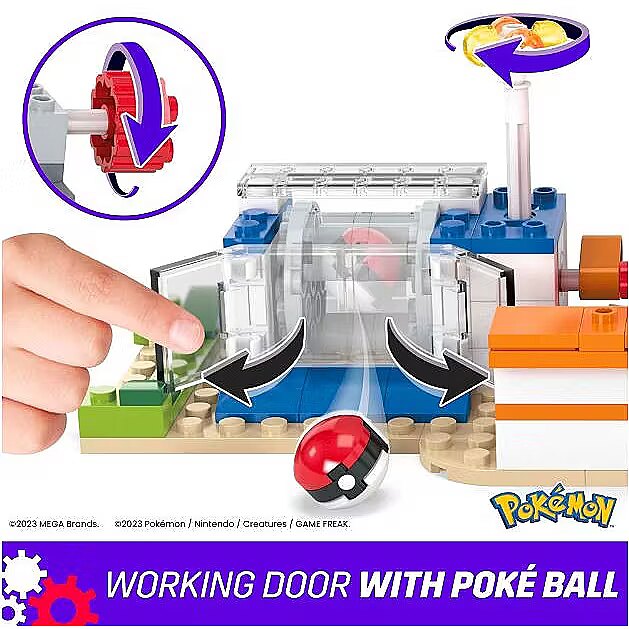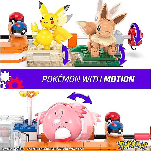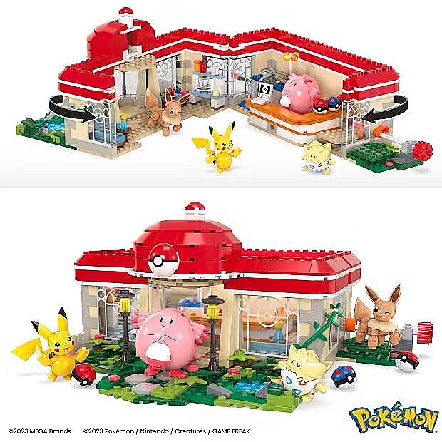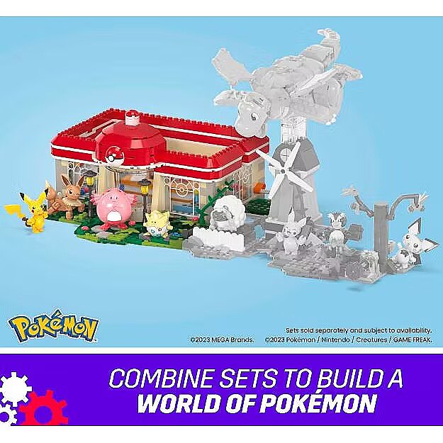 LongDesc - Welcome to the Pokémon Center! This iconic location is now a buildable set featuring four familiar faces: Pikachu, Chansey, Eevee, and Togepi. Turn the crank to see Chansey dancing, Pikachu and Eevee playing peek-a-boo, and Togepi opening the door. Combine with other Adventure Builder sets to create an expanded Pokémon world with motion; each sold separately.