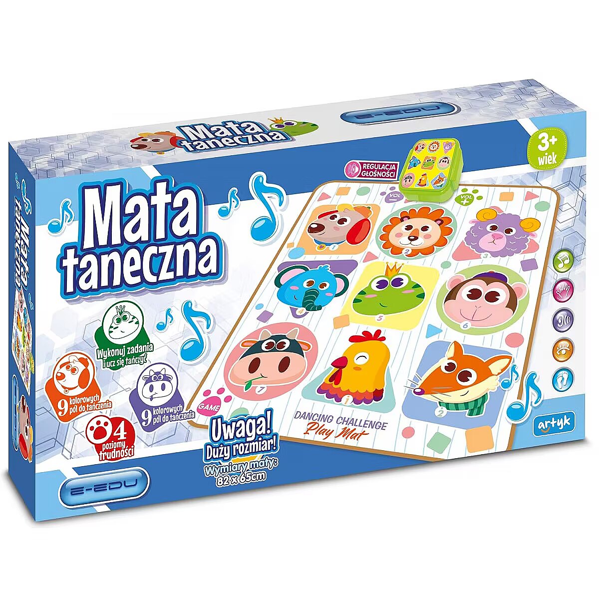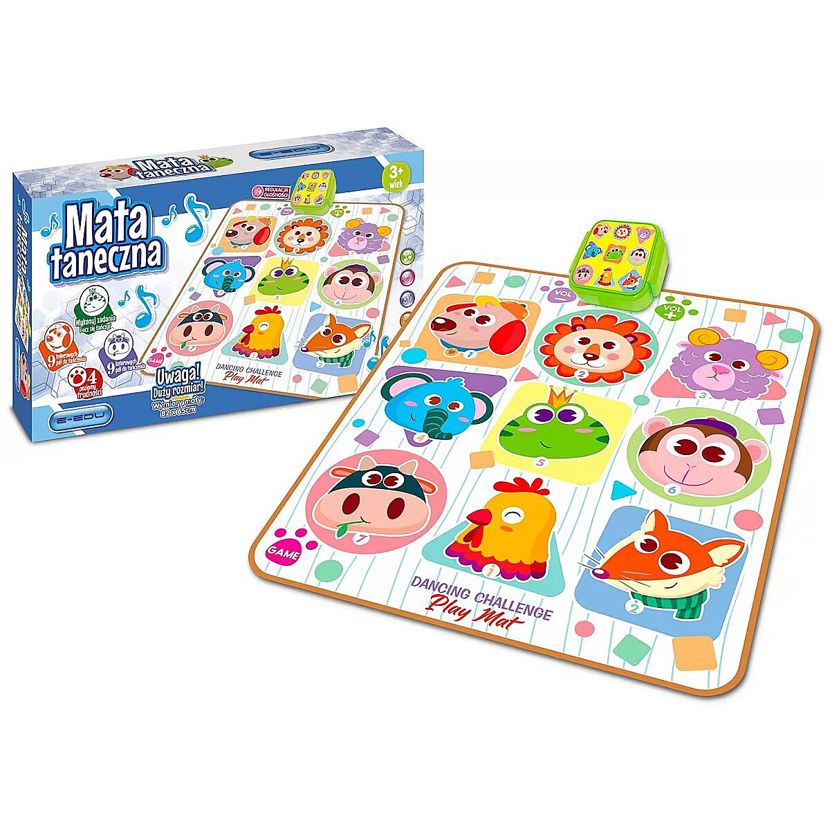Description - E-EDU DANCE MAT Features: 9 fields with pressure sensors Illuminated sound module Volume control 3 modes of play: Mode 1-3 with increasing level of difficulty, the higher the mode the more fields to press Mode 4, press the indicated boxes on the mat to keep the music playing Mode 5 piano, when the boxes are pressed, the sound of a classical piano in the C major range can be heard