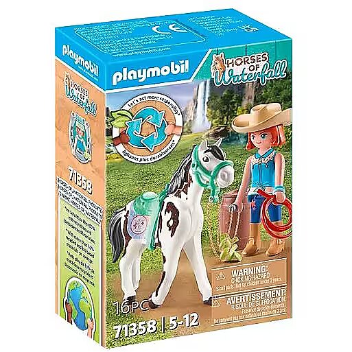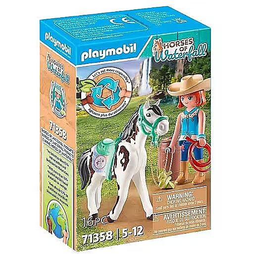 Description - Ellie's greatest passion is western riding. Her Tennessee Walker mare Sawdust, whose coat is flocked, also loves the challenge of working as independently as possible and reacting only to the slightest weight and thigh aids from Ellie. In order to influence Sawdust less via the reins, Ellie rides one-handed - like a real cowgirl! During horseback riding training at Waterfall Ranch, the two make several laps around a barrel. Fun Fact: Ellie's family has lived in Waterfall the longest, which means she knows the ranch area like the back of her hand. Discover the picturesque Waterfall Ranch in California's White Mountains. Here the five best friends Amelia, Isabella, Zoe, Ellie and Ben spend every free minute together with their horses. Between riding training and horse care, an exciting adventure always awaits them. Ellie is an enthusiastic western rider and trains whenever she can with her mare Sawdust. After the training there is of course a delicious reward. Sawdust is flocked and loves to be petted. A great gift or souvenir for horse-loving kids aged 4 years and up. Specifications: Lovingly designed horse toy with PLAYMOBIL figure Ellie, horse Sawdust, saddle, halter, lasso and many other extras for western riding and horse care The playsets of the new PLAYMOBIL horse world are made from over 80% recycled and bio-based materials