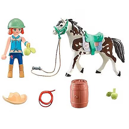 Accessories included - Figurine: Ellie Animals: horse Accessories: riding helmet, saddle, rug, halter, string with handle, 2 apples, lasso, barrel, hat