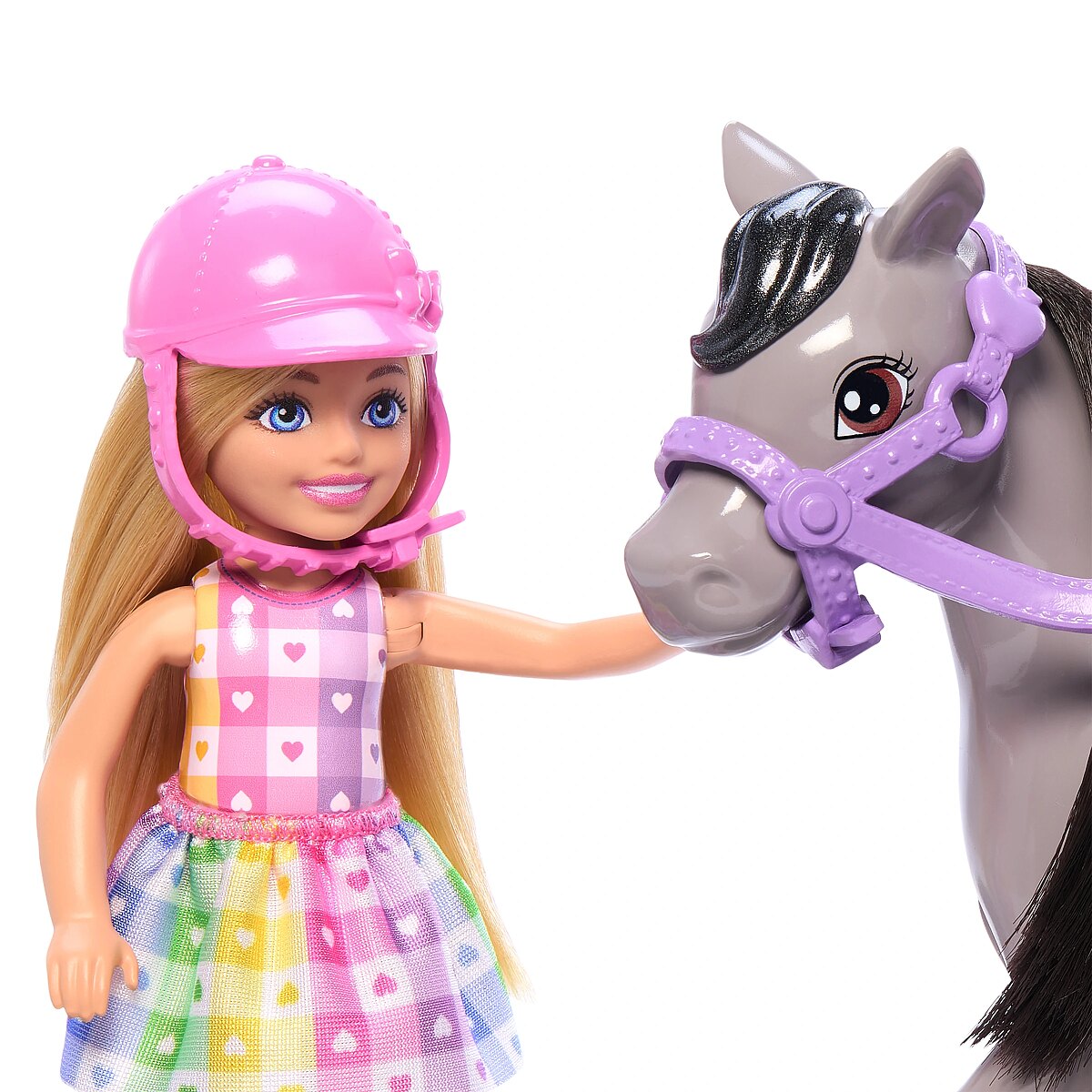 LongDesc - Chelsea and her sweet pony are ready to ride into playtime! Strap on Chelsea doll's pink helmet and sit her on the pretty pink saddle. Help her hold the reins then giddy up! Chelsea doll's knees bend and feet loop in the stirrups for a realistic ride on her toy horse. The little gray pony has a soft mane and tail for petting fun. Kids can let their imaginations run wild with Chelsea and her horse! Doll cannot stand alone. Colours and decorations may vary.