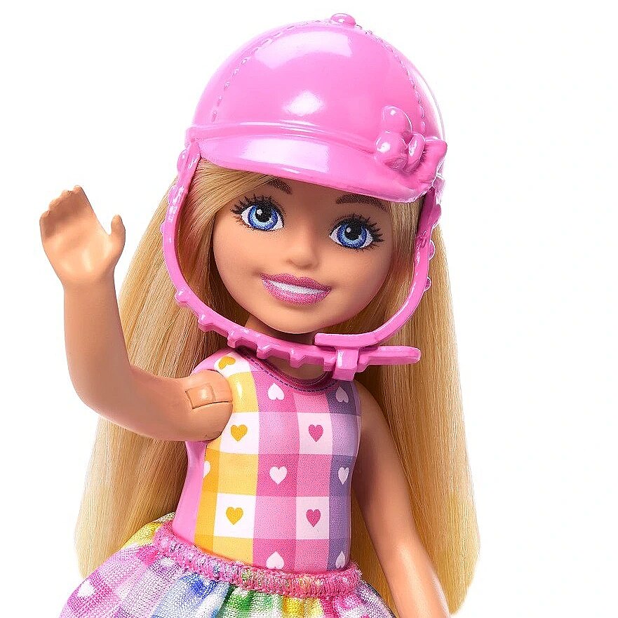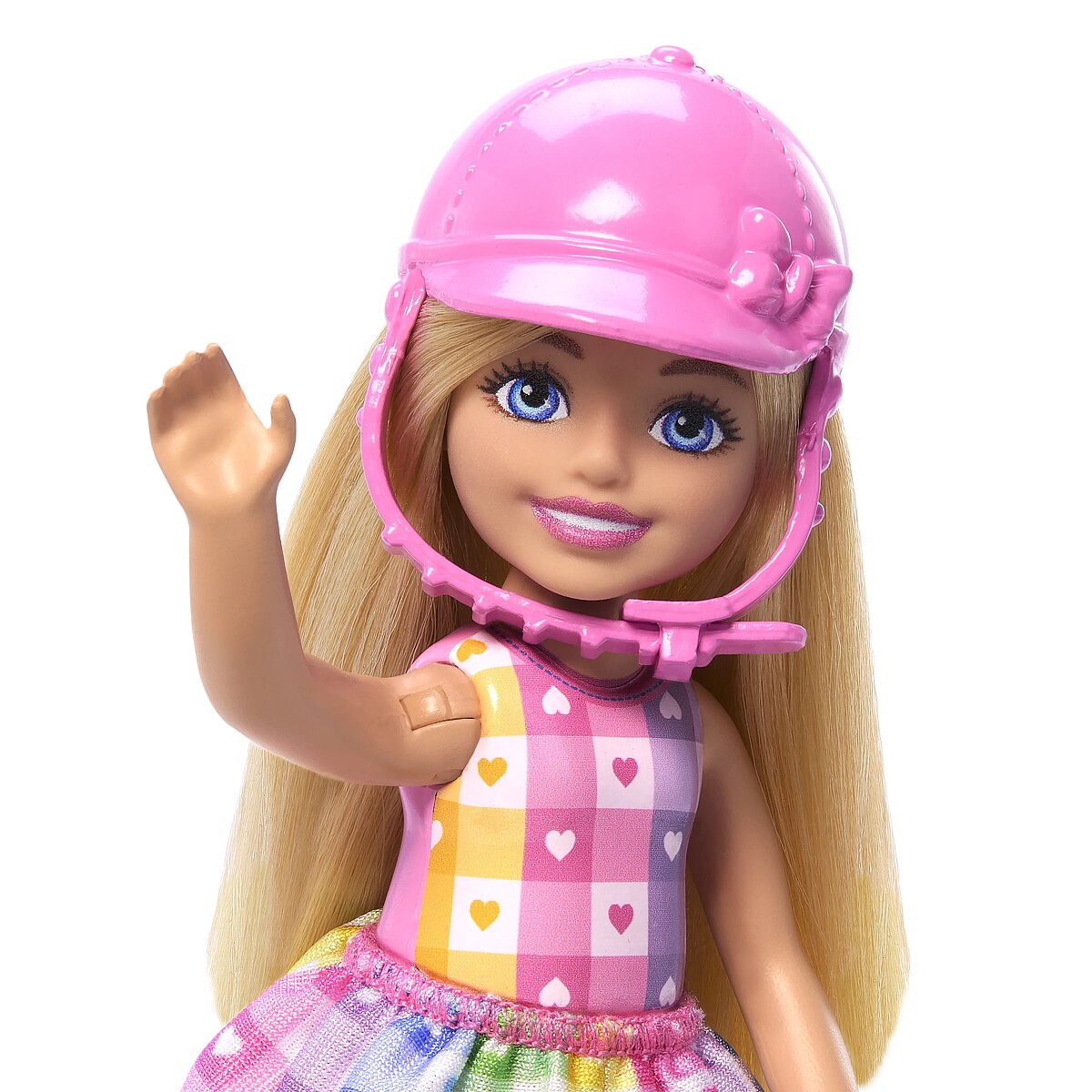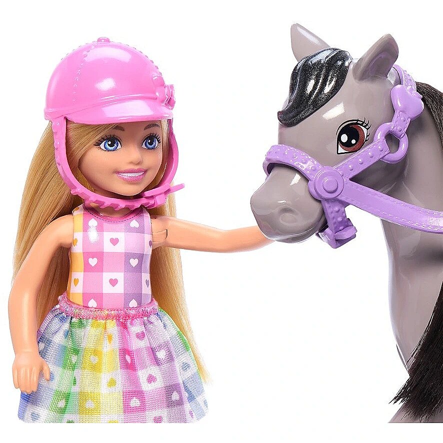 Description - Chelsea and her sweet pony are ready to ride into playtime! Strap on Chelsea doll's pink helmet and sit her on the pretty pink saddle. Help her hold the reins then giddy up! Chelsea doll's knees bend and feet loop in the stirrups for a realistic ride on her toy horse. The little gray pony has a soft mane and tail for petting fun. Kids can let their imaginations run wild with Chelsea and her horse! Doll cannot stand alone. Colors and decorations may vary.