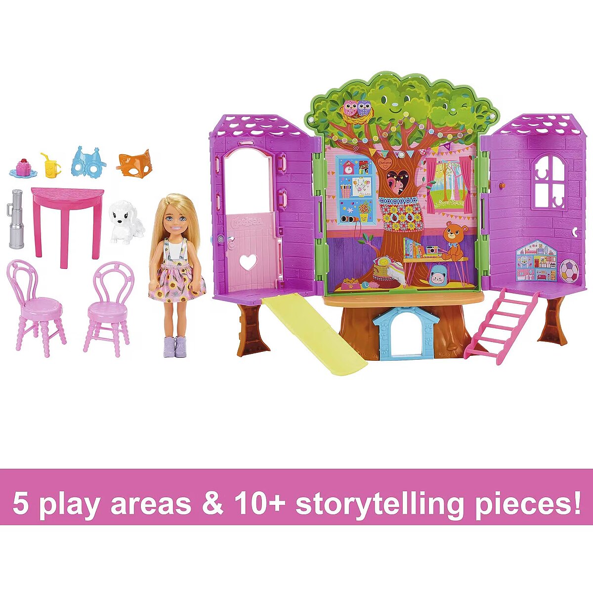 LongDesc - Kids can discover a treetop world of fun and adventure with this treehouse-inspired Barbie Chelsea playset. It has 10+ storytelling pieces and five different play areas for the included Chelsea doll. From donning a fox mask and playing pretend to swinging from a tree branch, so many activities await once she climbs up the ladder! Doll cannot stand alone. Colours and decorations may vary.