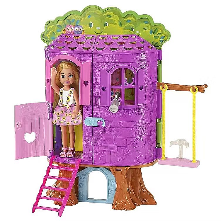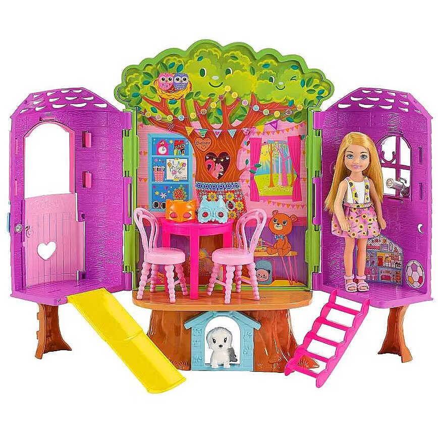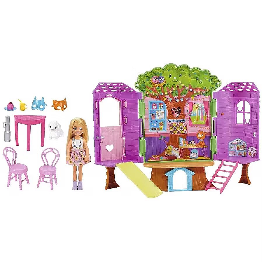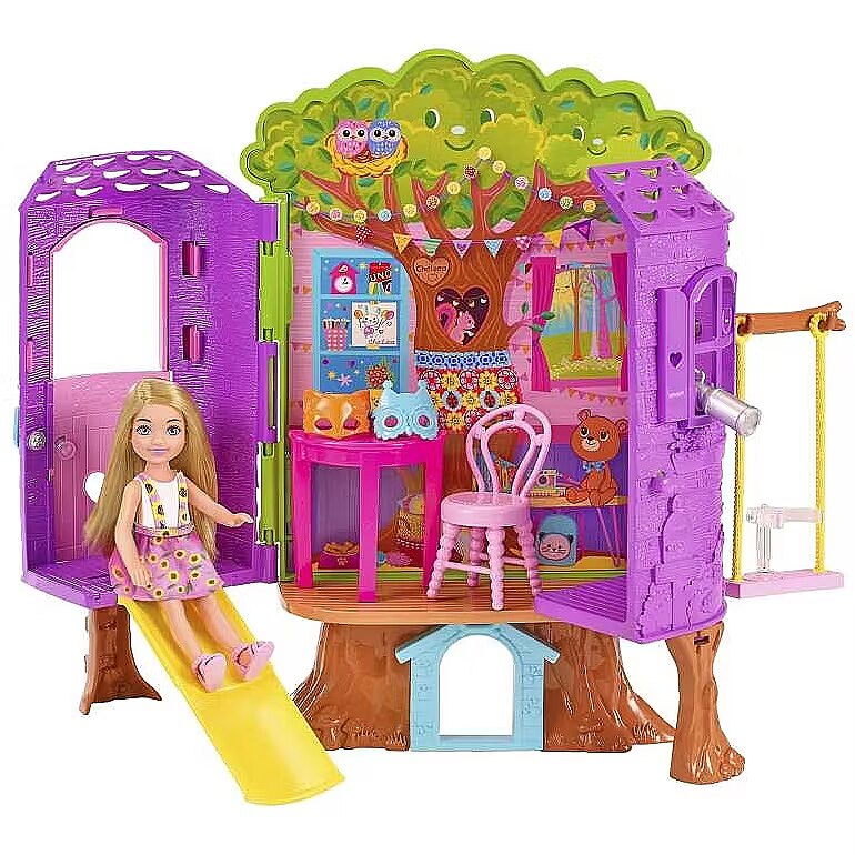 Description - Barbie Chelsea doll and tree house with puppy Children can explore a world full of games and discovery in the treetops with this Barbie Chelsea inspired tree house set. It includes over 10 storytelling elements and five different play elements for the Chelsea character. From creating a fox mask and pretending, to slithering up a tree branch when you reach the ladder, there's plenty of fun waiting for her! The doll cannot stand alone. Colours and decorations can happen. This Barbie treehouse set includes a Chelsea doll, puppy and adorable accessories for lots of imaginative fun! Chelsea doll is ready for a day of fun in a cute dress and floral shoes. Open the swinging door to the treehouse and send her up the ladder to get the adventure started! Open up the sides of the treehouse to reveal multiple play areas, or close it up for easy storage. There's even a puppy kennel in the tree trunk! Colourful storytelling elements add to the fun. Chelsea doll can play on the slide and swing, dress up in animal masks, enjoy a sweet snack and watch the stars through the telescope! Chelsea's sets include cute dolls and adorable details that will make a great gift for children aged 3 and up. Each sold separately, subject to availability.