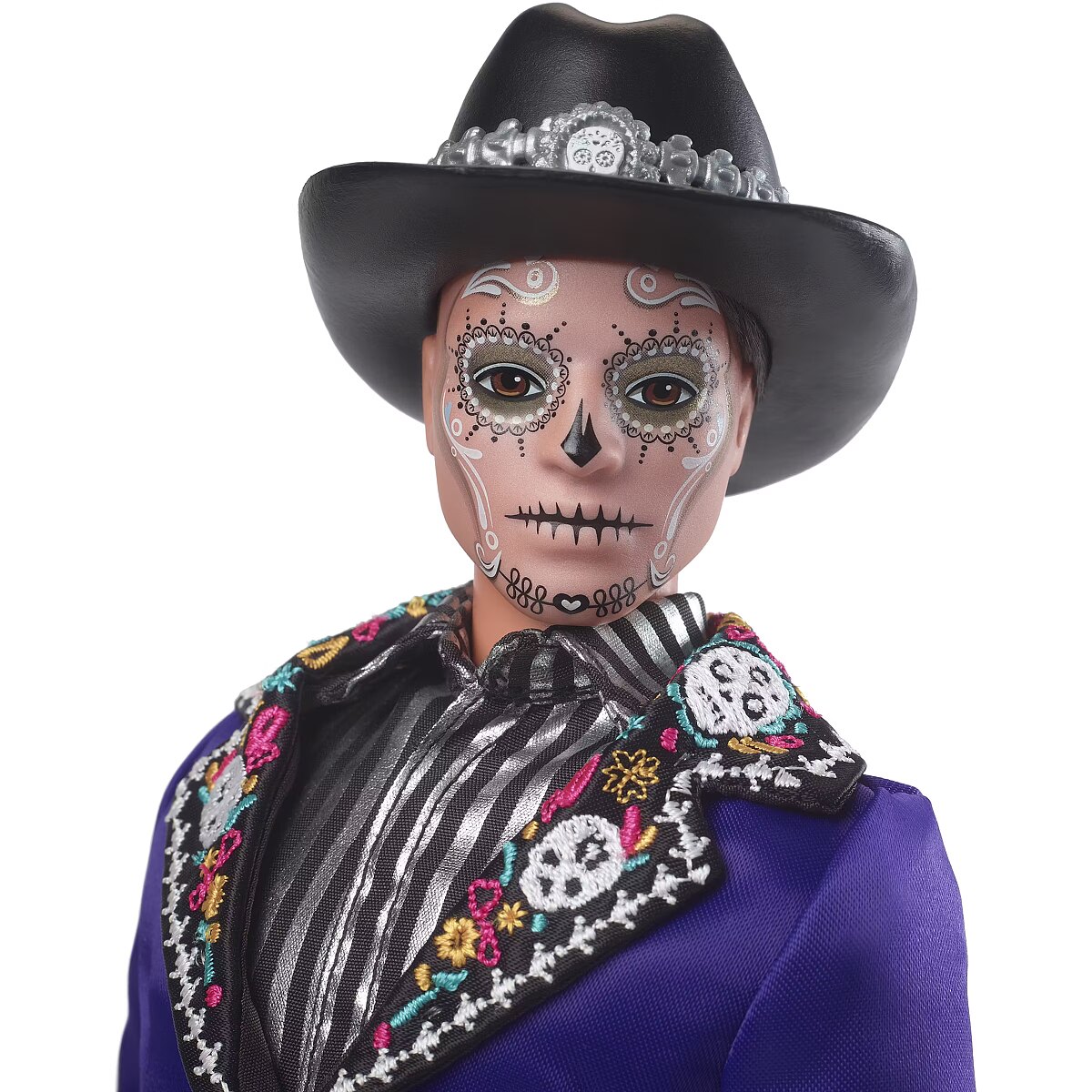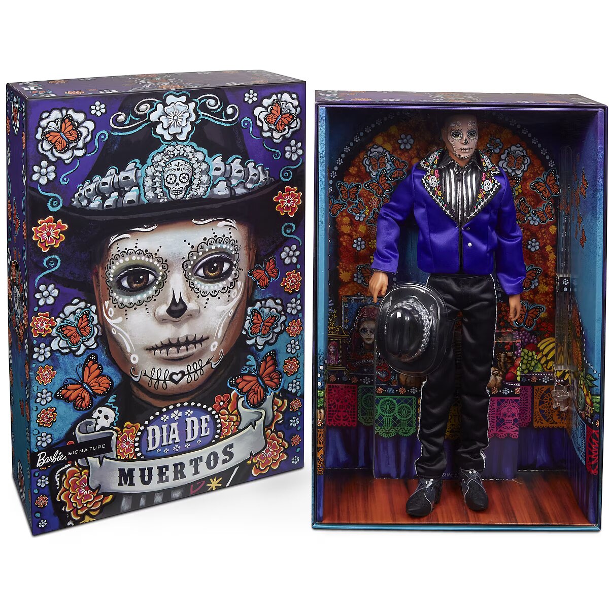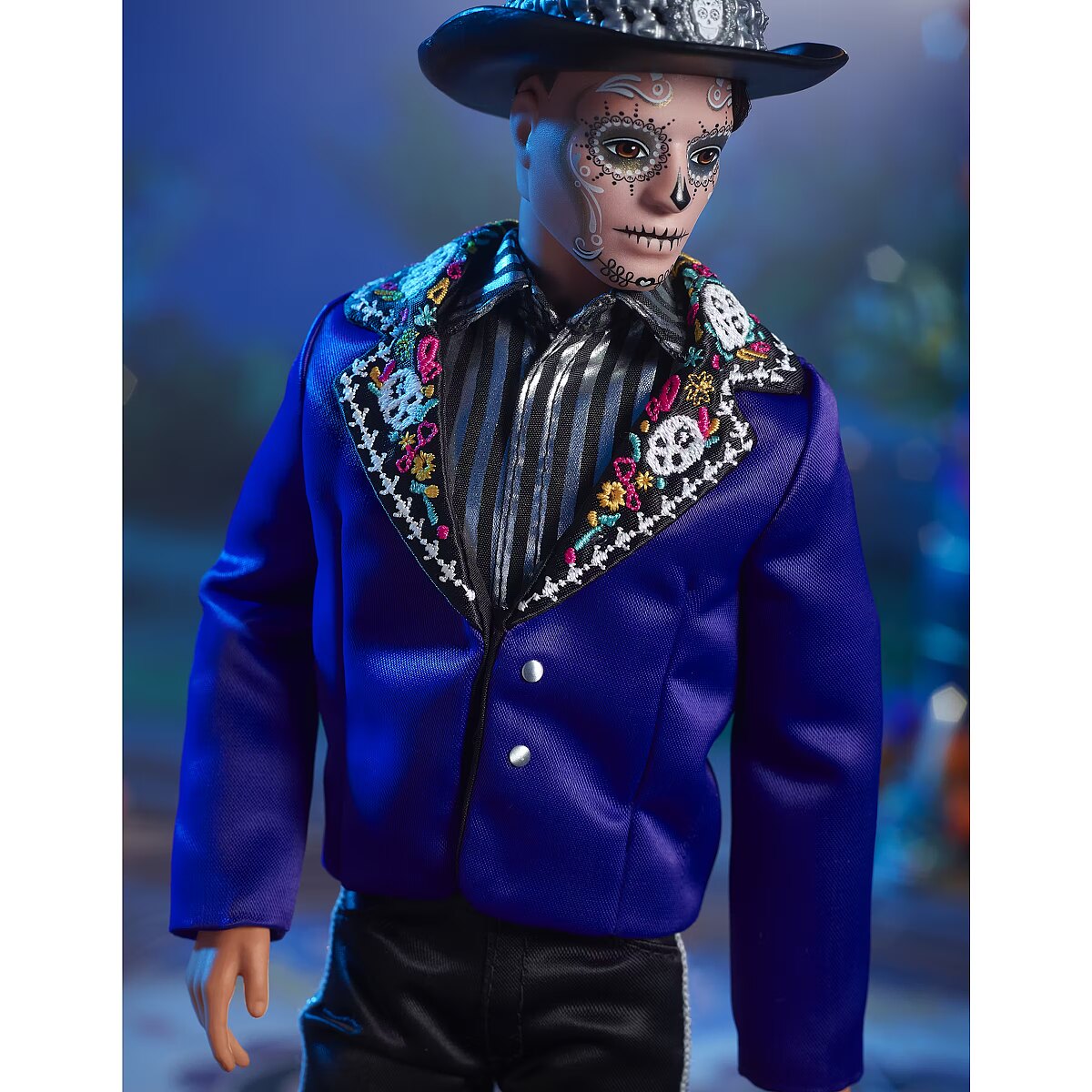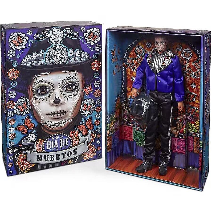 LongDesc - The Barbie Día De Muertos series honors the customs, symbols and rituals often seen throughout the festive time of remembrance. Ken doll is strikingly handsome in a blue jacket with embroidered bone detail at the lapels. A sugar skull-accented hat frames his calavera face paint. May the 2023 Día De Muertos Ken doll become a treasured holiday tradition! Includes doll stand and Certificate of Authenticity. Doll cannot stand alone. Colours and decorations may vary.