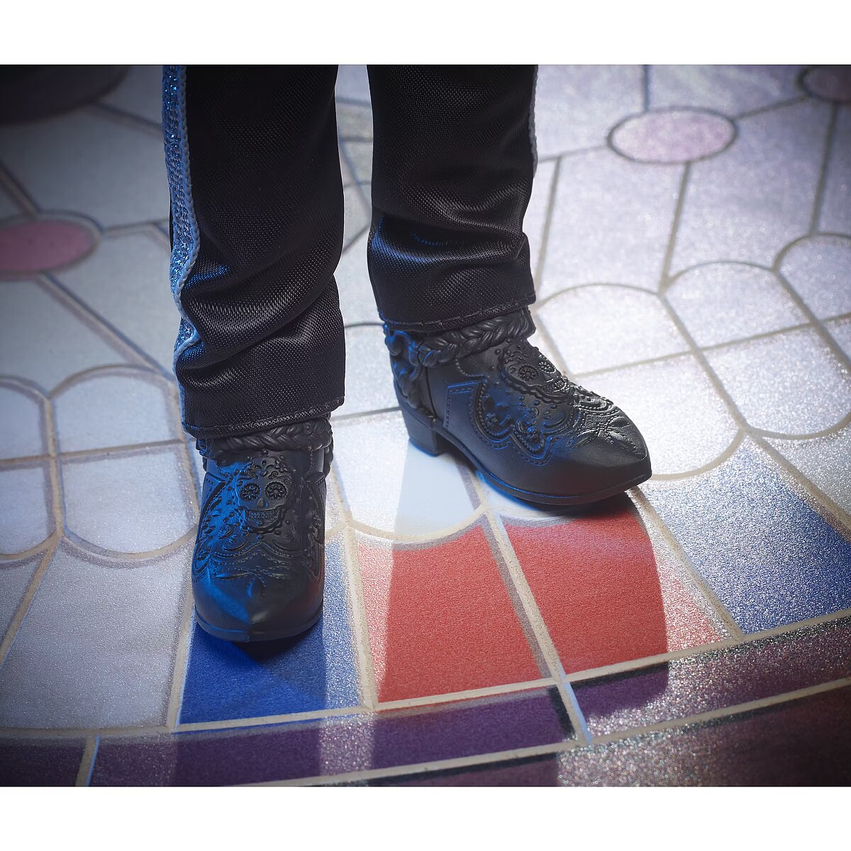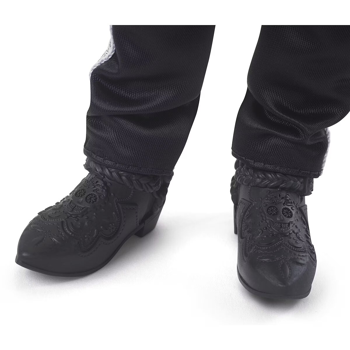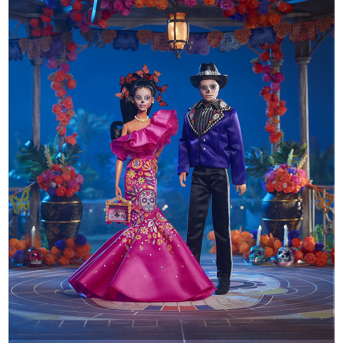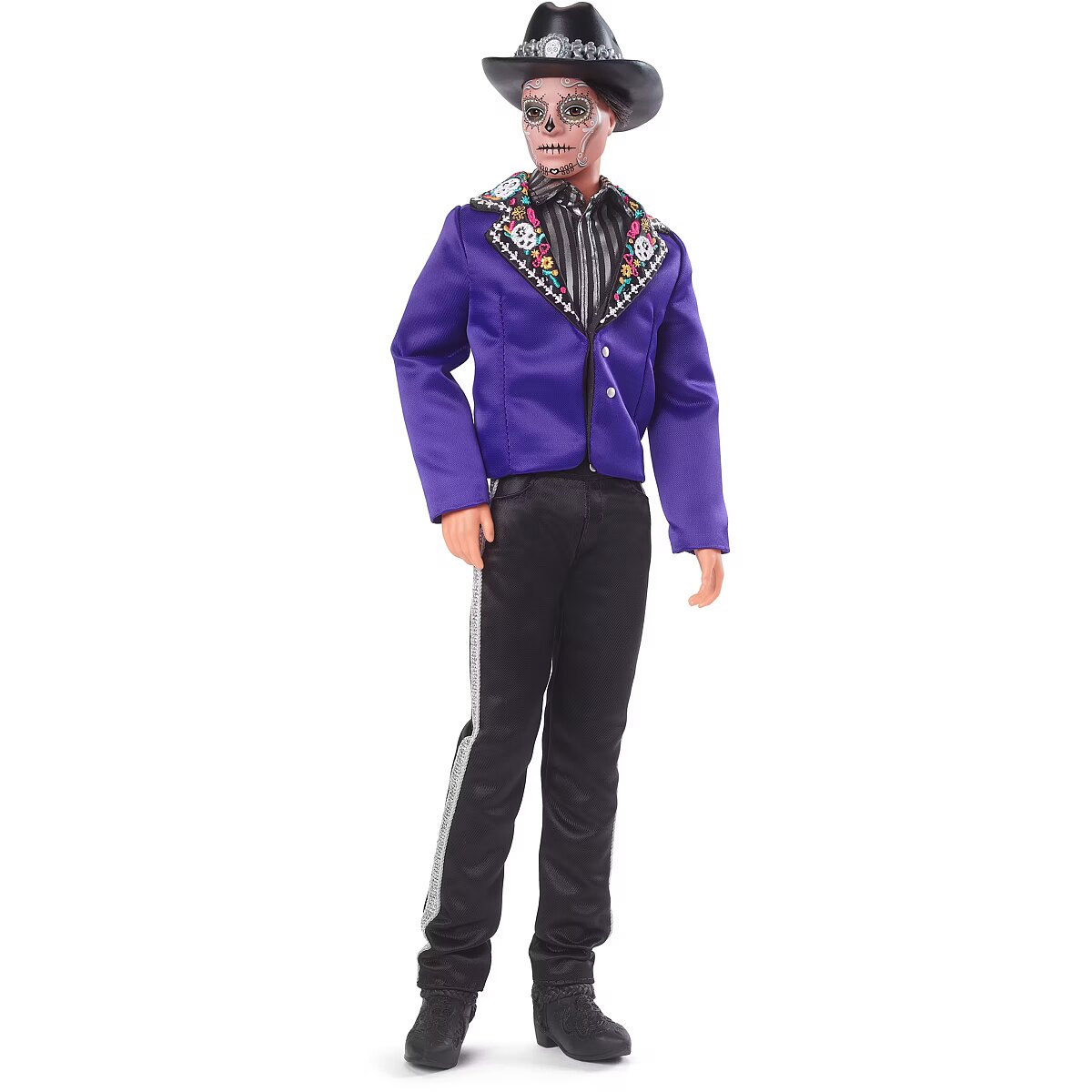 LongDesc - The Barbie Día De Muertos series honors the customs, symbols and rituals often seen throughout the festive time of remembrance. Ken doll is strikingly handsome in a blue jacket with embroidered bone detail at the lapels. A sugar skull-accented hat frames his calavera face paint. May the 2023 Día De Muertos Ken doll become a treasured holiday tradition! Includes doll stand and Certificate of Authenticity. Doll cannot stand alone. Colours and decorations may vary.