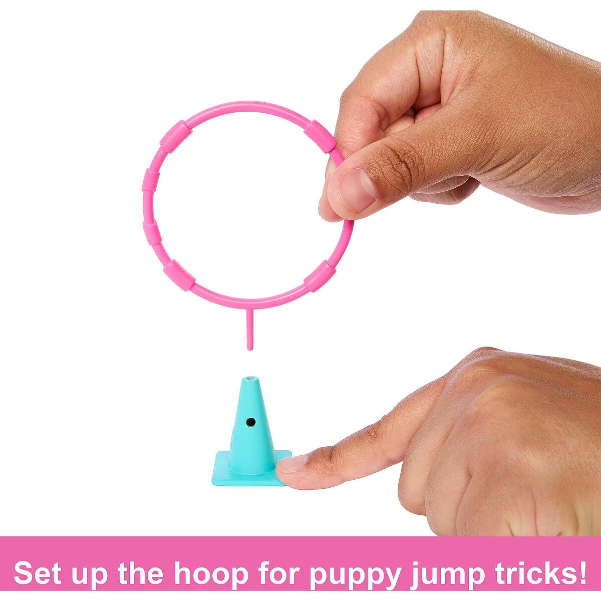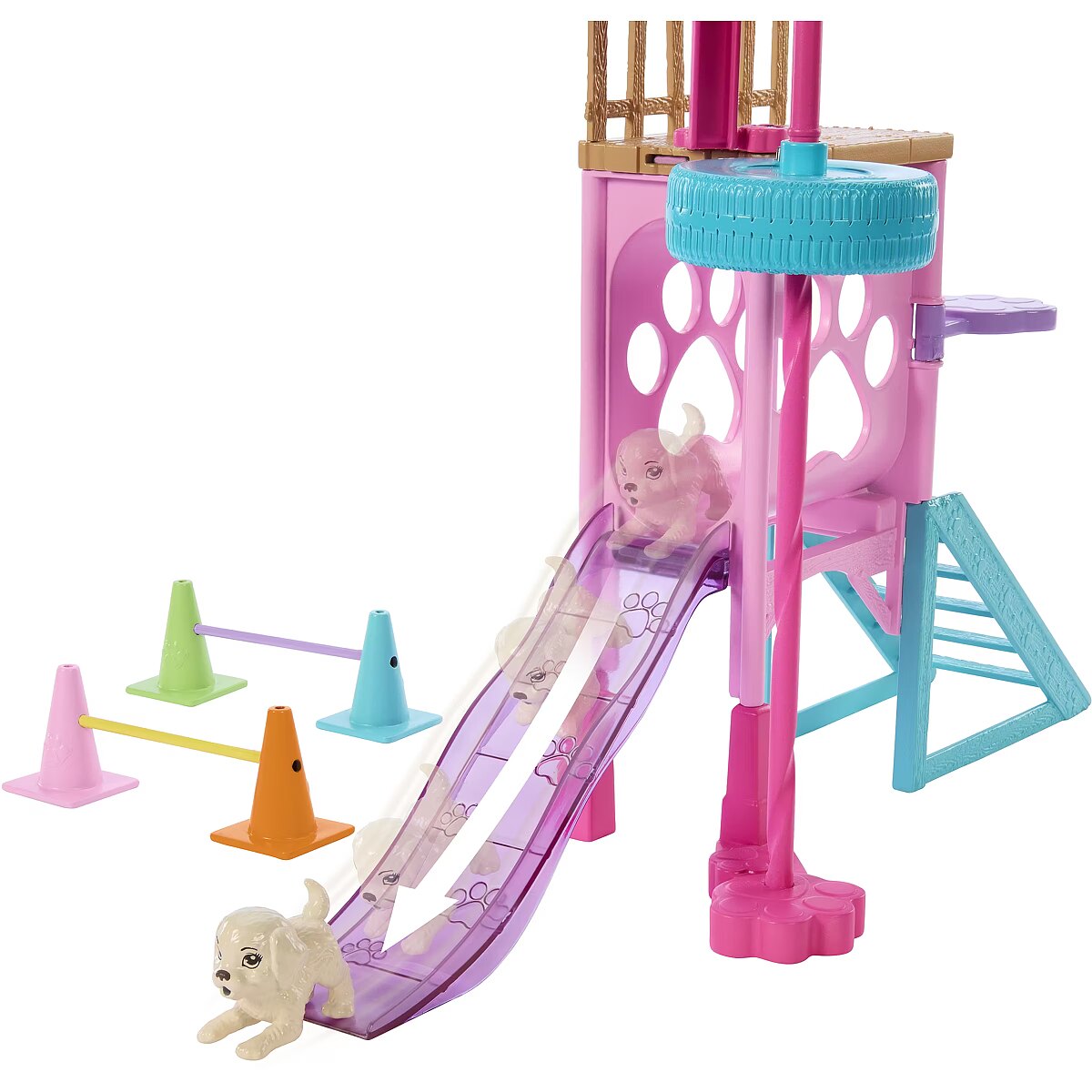 LongDesc - Pounce into fun with this puppy obstacle course playset! With 20+ total pieces, there are so many ways to play with Stacie doll and her pack of three pups. The dogs can spin down the tire tower, slip down the slide, jump through hoops, and so much more with this buildable puppy playground. Just like in the movie Barbie and Stacie to the Rescue, kids can help Stacie doll train and take care of her fur-ever friends with this buildable obstacle course and accessories like dog toys, treats, a trophy, and pet bed. Doll cannot stand alone. Colours and decorations may vary.