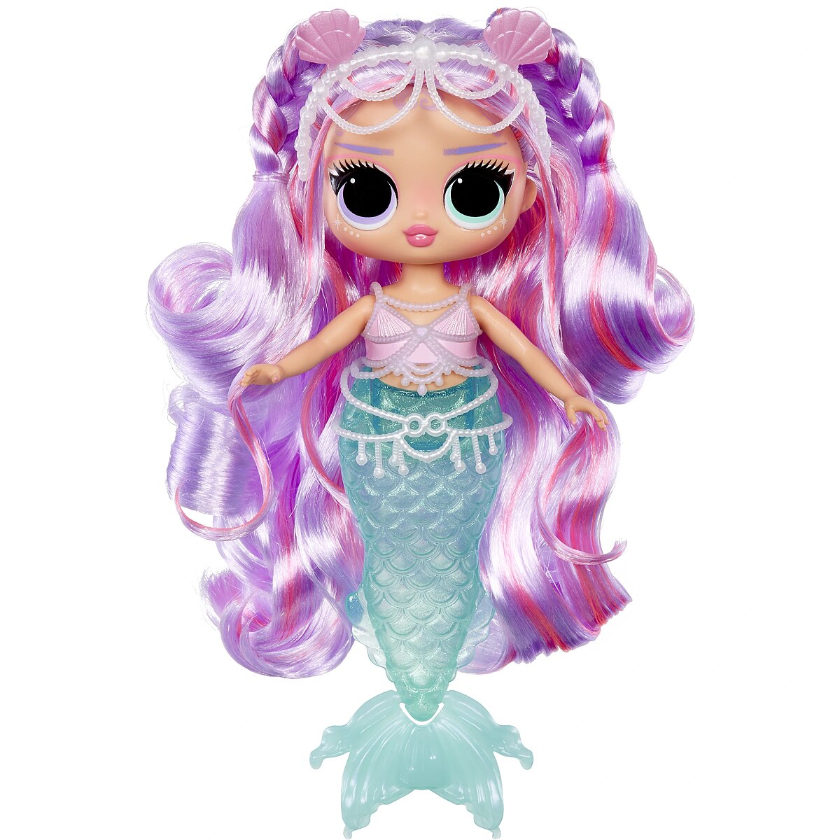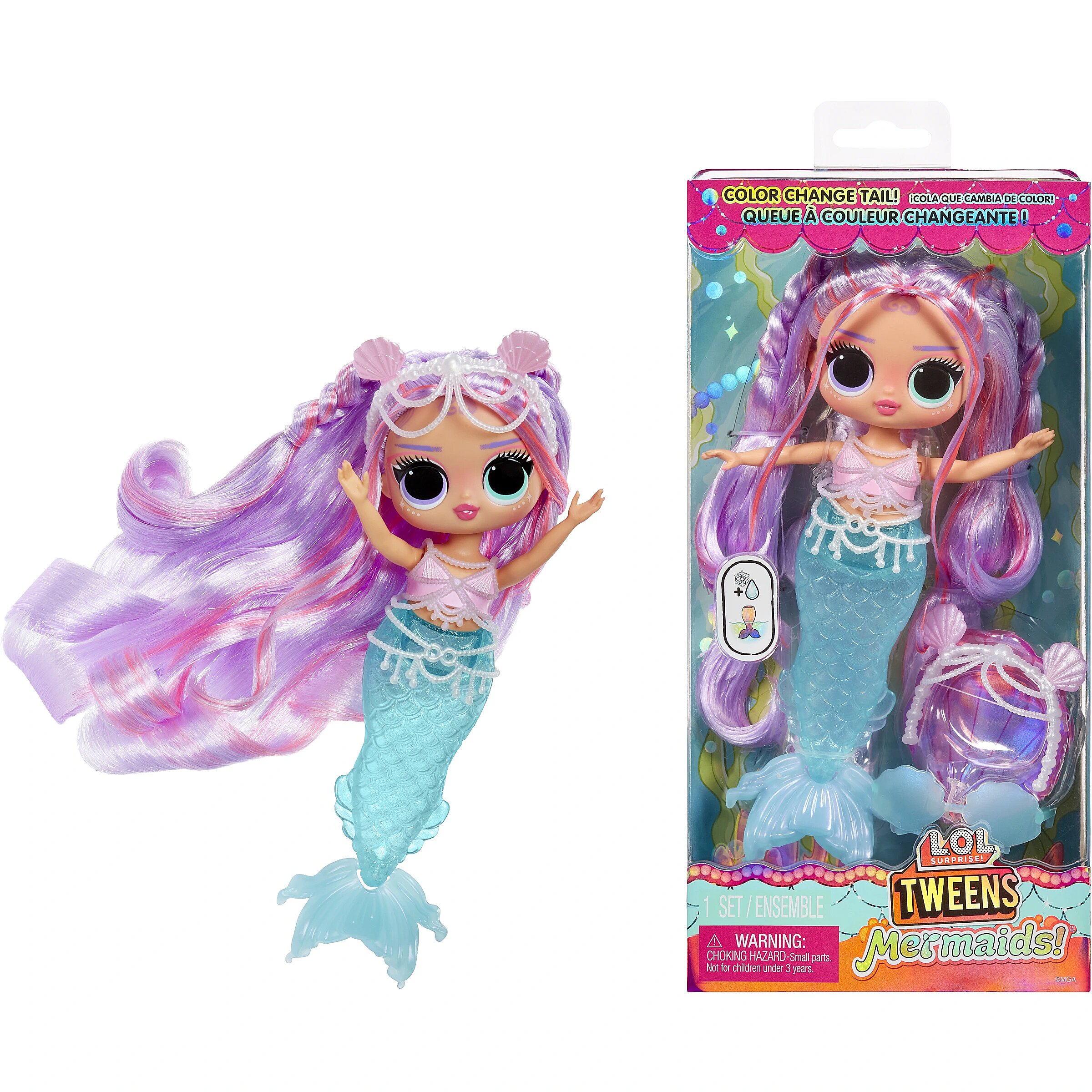 LongDesc - I'm in Be Tween, with underwater style and colorful surprises like you've never seen! Look out world, cuz we mermaids are going to make a splash!Get ready to dive into an enchanting world of magical mermaid fun with the all-new L.O.L. Surprise Tweens Mermaid Lana Marine™ fashion doll with dazzling accessories to unbox! Perfect for bath time and imaginative play, Lana Marine™ brings a splash of excitement with her beautiful color-changing tail and mesmerizing fin that can move back and forth! Dip your Tweens Mermaid doll into cold water and watch as her tail transforms colors from aqua blue to pearl purple, creating a magical underwater experience! Can you guess what her aqua blue fin changes colors to? Don’t forget to style your doll with her charming accessories including her sea shades, sea shell and pearl tiara, and cute pearl encrusted top! She has stunning features, gorgeous hair, her own fashionable mermaid look, and comes articulated for tons of posing opportunities, including sitting as she bends at her waist! She can even stand on her fin, making styling your doll even easier with greater stability! Discover what’s inside each box including a fabulous L.O.L. Surprise Tweens Mermaid doll, glasses, a headband, and a pearl encrusted accessory to complement the doll’s top and tail! Collect all 4 glamorous L.O.L. Surprise Tweens Mermaid fashion dolls: Cleo Cove™, Lola Waves™, Lana Marine™, and Serena Finn™ for a complete set of endless mermaid fun! L.O.L. Surprise fashion dolls with stylish hair, outfits and many detailed accessory pieces make a perfect toy for kids, including 4 years old and up for imaginative pretend play! As gifts for any special occasion, dolls provide hours of social play with siblings and friends! From MGA Entertainment, creators of L.O.L. Surprise fashion and collectible dolls, Rainbow High™ fashion dolls, Na Na Na Surprise dolls, Bratz® fashion dolls, MGA's Dream Ella™, MGA's Glitter Babyz™, Lalaloopsy™, Baby Born® Surprise baby dolls and collectibles, Little Tikes® kids' toys and many other favorite brands.
