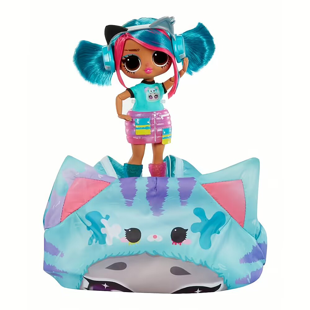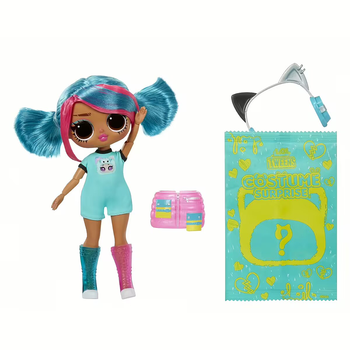 LongDesc - Adorably Awkward or Too Cool 4 School! Music Venue or Nail Salon! Stripes or Dots! – Emma Emo Get ready to unwrap the ultimate surprise and dive into an unboxing adventure like no other with the all-new L.O.L. Surprise Tweens Costume Surprise™ including fan-favorite fashion doll Emma Emo in a trendy new look and her adorable inflatable kitty costume. This outrageously fun, experiential reveal is bursting with layers of surprises, perfect for endless imaginative and storytelling play for kids. Discover what’s inside by first tearing the zipper at the bottom of the packaging and lifting up the outer pink shell to reveal a mystery wrapping paper, kicking off the first stage of the inflating process! Watch as the paper grows bigger and fuller and once completely inflated, rip open the paper to discover your charming teal kitty costume! But wait, the surprise doesn’t stop there! Undo the velcro from the back of the kitty’s head to unveil your gorgeous Tweens Emma Emo doll hidden inside! Don’t forget to unbox the cute surprises and remove the Tweens doll from her doll stand to dress her in trendy new fashions and accessories including a fashionable skirt, stylish headphones with kitty ears to match her huggable costume, and colorful chic shoes! Close up the pet costume and watch as it grows and fully inflates, giving you two best friends to play with together – Emma Emo and her kitty costume! And the fun doesn’t stop there - simply toggle the on and off switch at the bottom of your pet costume to repeat the inflating fun over and over again! Each Tweens doll has stunning features, glamorous hair, her own fabulous style, and comes articulated for tons of posing opportunities alongside her new pet costume friend! Collect all 4 dazzling L.O.L. Surprise Tweens Costume Surprise™ fashion dolls and their soft pet costumes: Aya Cherry with her bunny costume, Emma Emo with her kitty costume, Ali Dance with her puppy costume, and Hoops Cutie with her panda costume! Don’t forget to watch and catch the Tweens dolls and their pet costumes in action in the all-new L.O.L. Surprise SkateDance Movie, premiering October 2024 on YouTube Kids!