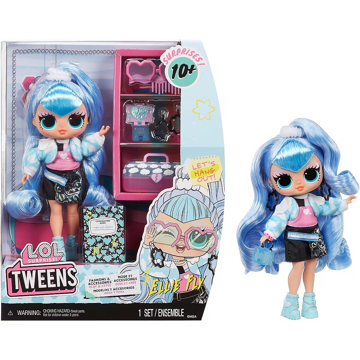 LongDesc - I’m in Be Tween, but right where I wanna be. Full of surprises & unique style. Look out world, cuz here I come.Introducing the all-new L.O.L. Surprise Tweens fashion doll Ellie Fly, dog mom to pet puppy character, Ruff Raver! Unbox 10+ surprises and get to know Ellie Fly, with her head in the clouds and her heart on her sleeve, she’s a friend to all animals. Ellie Fly is quirky and cute, and she’s always there to lend a helping hand to any paw! She loves to cuddle up in something cozy, especially in her color block top and her fashionable cloud print jacket. She reps her love for animals with her stylish skirt, designed with a print of her pet! Her outfit also includes adorable, cloud print platform boots to match her coat, heart shaped sunglasses, a trendy boxy style purse, and beautiful matching necklace, bracelets, and earrings! She also has the cutest throwback caboodle, designed in her signature cloud print and an adorable makeup palette. She has stunning features, beautiful hair, her own fabulous style, and comes articulated for tons of posing opportunities. Each box includes a L.O.L. Surprise Tweens fashion doll, unique fashions, shoes, purse, sunglasses, accessories, caboodle, makeup palette, and hairbrush. Collect all L.O.L. Surprise Tweens fashion dolls: Ellie Fly, Hana Groove, Flora Moon, and Cassie Cool! L.O.L. Surprise fashion dolls with stylish hair, outfits and many detailed accessory pieces make a perfect toy for kids, including 4 years old and up for imaginative pretend play! As gifts for any special occasion, dolls provide hours of social play with siblings and friends! From MGA Entertainment, creators of L.O.L. Surprise fashion and collectible dolls, Rainbow High™ fashion dolls, Na Na Na Surprise dolls, Bratz® fashion dolls, MGA's Dream Ella™, MGA's Glitter Babyz™, Lalaloopsy™, Baby Born® Surprise baby dolls and collectibles, Little Tikes® kids' toys and many other favorite brands.