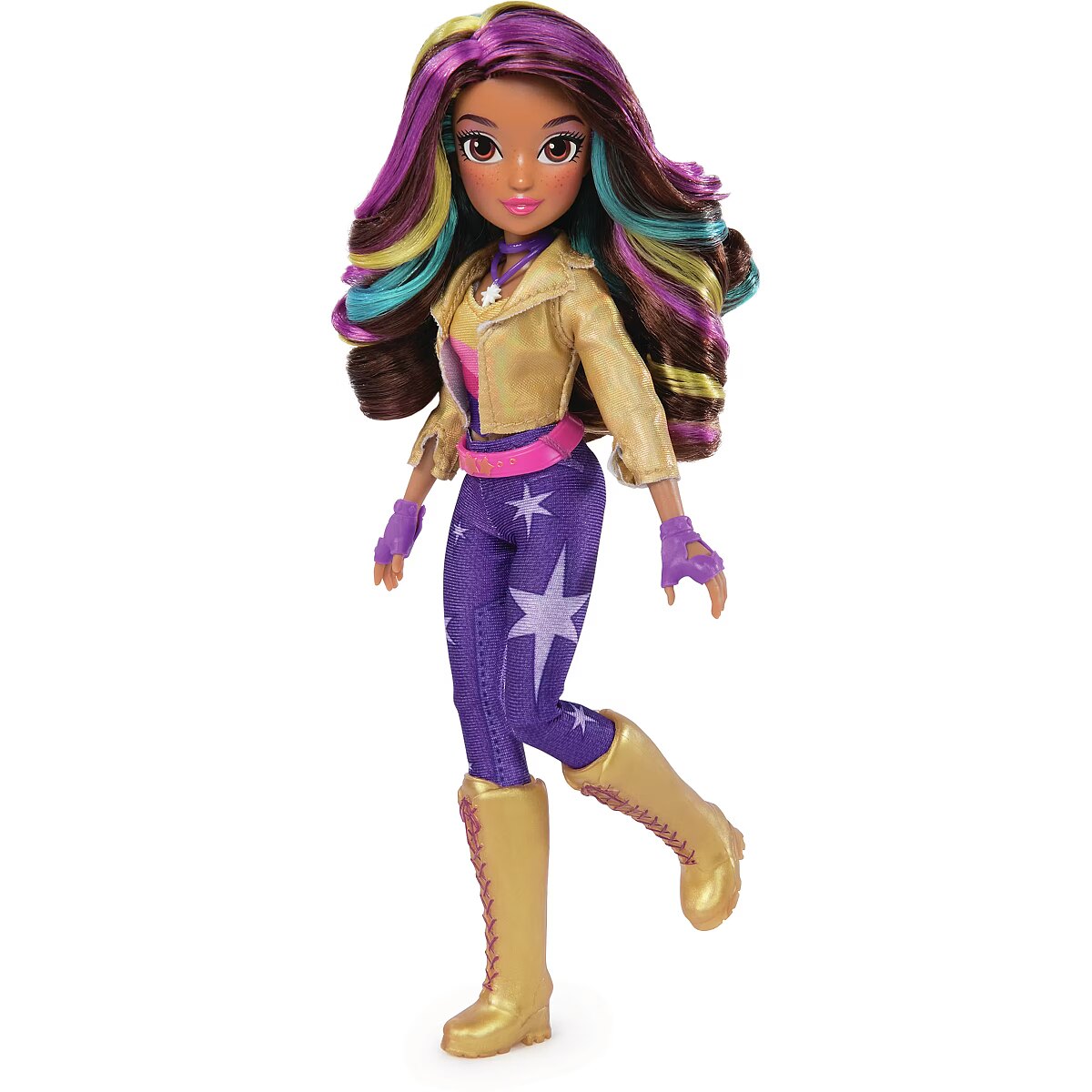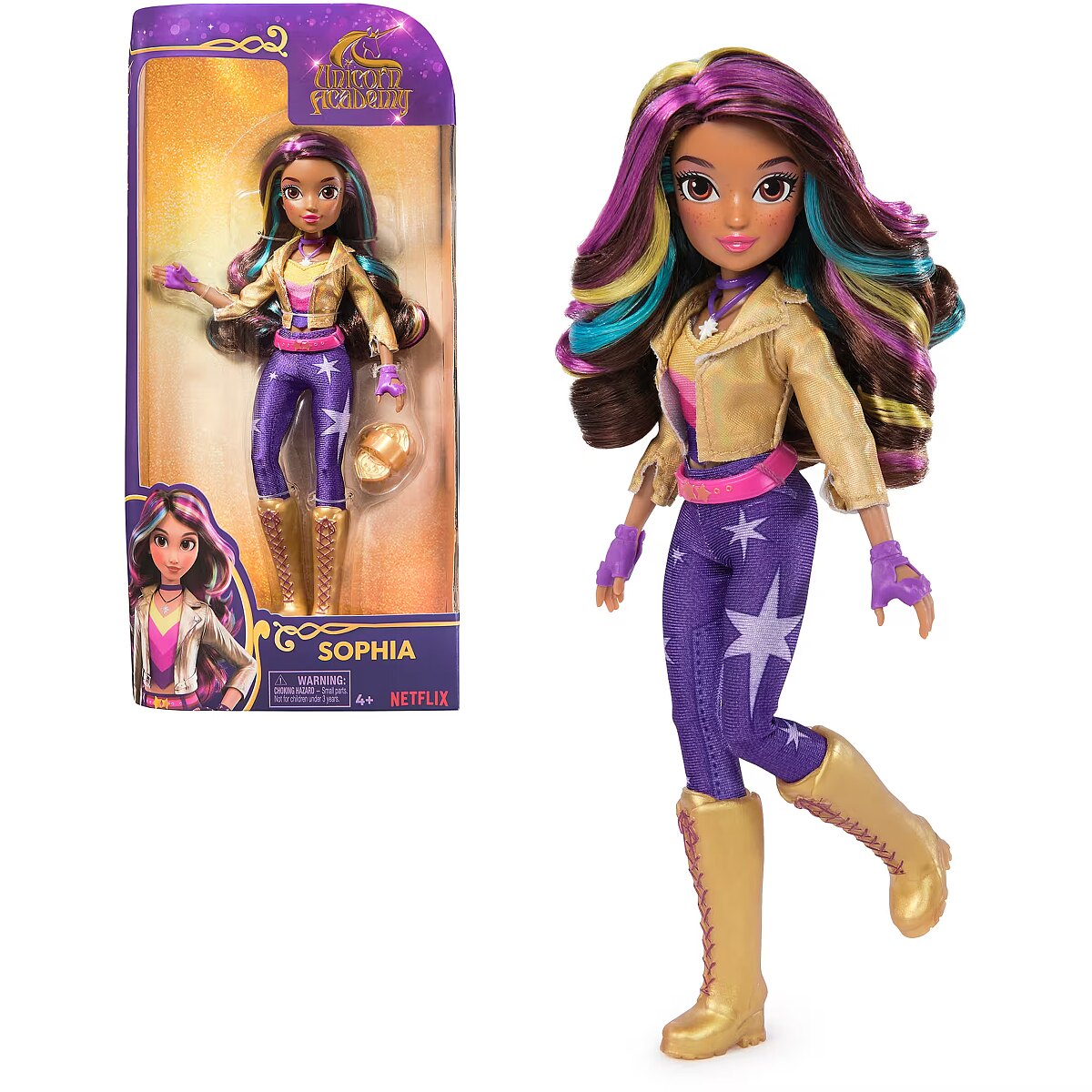 LongDesc - Create enchanting Unicorn Academy adventures at home with Sophia, Ava, and Isabel fashion dolls. Inspired by the NETFLIX animated show and best-selling book series where friendship reins, these 9.5-inch dolls for girls bring the characters to life. Beautifully detailed from head to toe, Sophia’s rebellious and adventurous personality comes through in her brushable rainbow highlighted hair (styling accessory included) and her signature unicorn rider outfit: rainbow top and pants with Light Magic markings, gold jacket, lace up boots, gloves, belt, and necklace doll accessories. With 9 points of articulation, pose Sophia as you protect Unicorn Island and its magic, and ride into adventure with her unicorn, Rainbow Light-up Wildstar (sold separately). The magical bonds between Unicorn Academy students and their unicorns will spark endless imaginative storytelling. For more ways to experience Unicorn Academy with your favorite characters, look for Ava and Isabel dolls and their unicorns, Leaf and River (each sold separately) and expand your world. For kids who enjoy unicorns and horse toys, dolls & accessories, doll house play, collectibles, plush toys and more, Unicorn Academy toys are fun birthday gifts for girls or gifts for any occasion. Bring home the magic of Unicorn Academy with the Sophia Doll.Includes: 1 Doll, 6 Removable Fashion Pieces, 1 Hair Styling Tool
