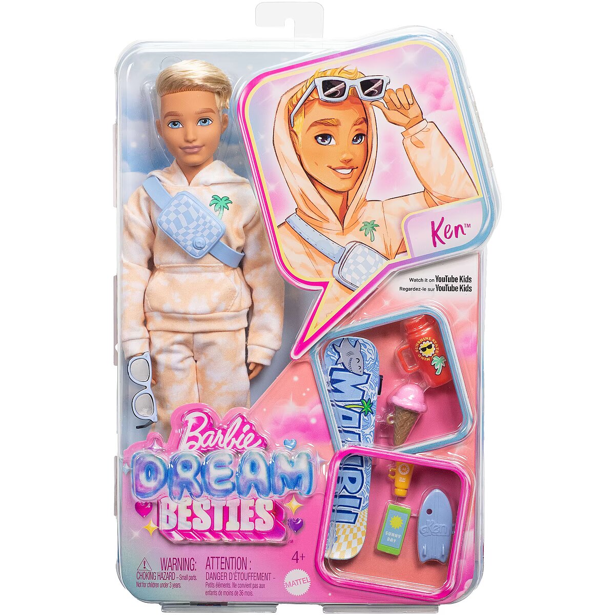 LongDesc - The Barbie Dream Besties dolls encourage kids to share their unique talents with the world, just like Ken! Ken dreams of creating viral videos about the environment and protecting animals help him chase his dreams with 9 different accessories, including his skateboard, sunscreen, water bottle, and phone! The fashion doll also has rooted blonde hair for styling fun. The Barbie Dream Besties dolls inspire kids ages 4 years old and up to live out their dreams. Doll cannot stand alone. Colours and decorations may vary.