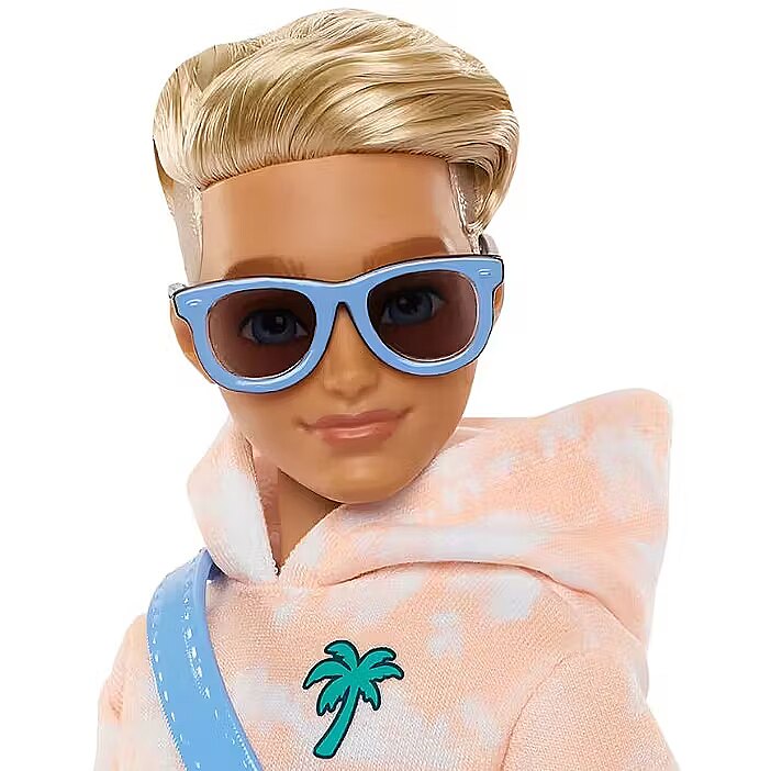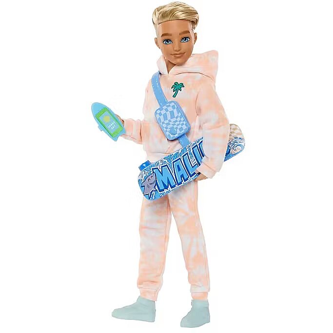 Packaging content - Packaging content - Includes 1 Barbie Dream Besties Ken doll wearing a sweatshirt, sweatpants, and shoes, 1 pair of sunglasses, 1 phone, 1 sunscreen, 1 skateboard, 1 fanny pack, 1 pair of sunglasses, 1 water bottle, 1 surfboard phone case, and 1 ice cream cone. Doll cannot stand alone. Colours and decorations may vary.