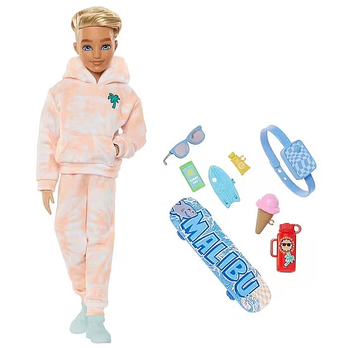 Accessories included - 1 lalka Barbie Dream Besties Ken w bluzie, spodniach dresowych i butach 1 para okularów przeciwsłonecznych 1 telefon 1 krem z filtrem 1 deskorolka 1 saszetka 1 butelka wody 1 etui na telefon w kształcie deski surfingowej 1 rożek lodowy