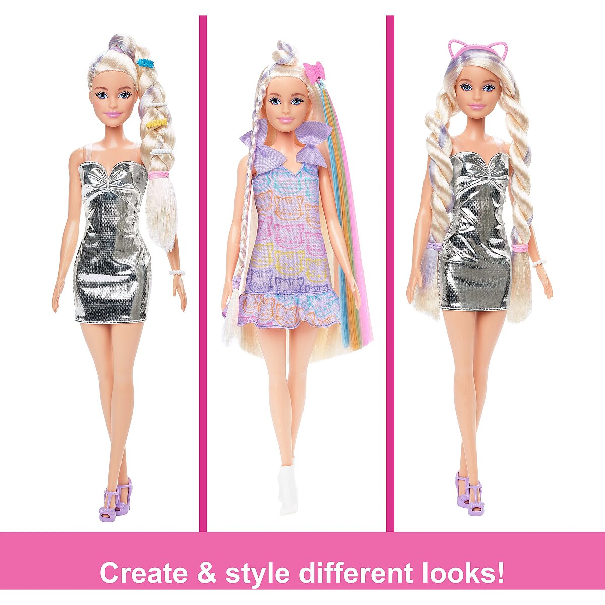 Description - The Barbie Fun & Fancy collection features cute dolls modeling colorful hairstyles and glam looks! Each doll has 8.5 inches of extra-long playable hair and includes 10 total fashion and styling accessories. Kids will love creating different hairstyles and exploring outfit possibilities! Each sold separately, subject to availability. Dolls cannot stand alone. Colors and decorations may vary. Devoted to all things hair, the Barbie Fun & Fancy Hair collection showcases glam dolls with colorful hairstyles -- plus, 10 included fashion and styling pieces for endless customization! Barbie doll has 8.5 inches of extra-long playable blonde hair with fantasy pops of color for extra-fun hairstyles! The fashion doll wears a colorful dress with cat print and big bows, accessorized with white boots. She comes with a second look for a style transformation -- a silver metallic dress and purple heels! Styling accessories include a clip with rainbow hair extension, cat ear headband, set of hair ties and one set of hair clips! Once kids have created their hairstyles, they can comb out Barbie doll's tresses and create a new look -- from colorful updos to layered braids, the possibilities are endless and hours of fun! Barbie Fun & Fancy hair dolls make a great gift for kids 3 years old and up, especially those who love exploring new looks, hairstyles and fashion!