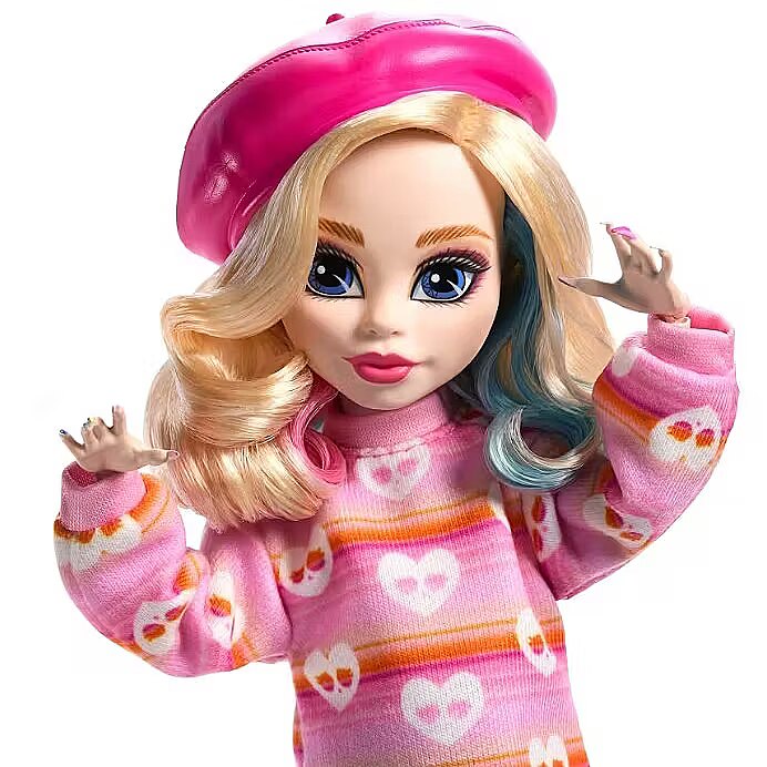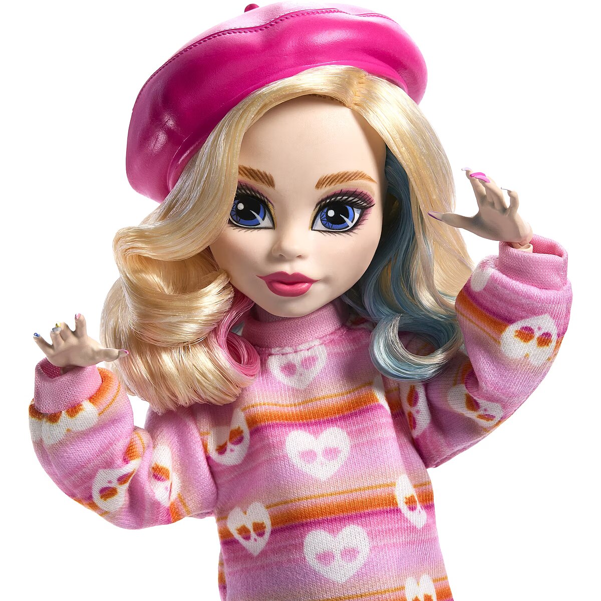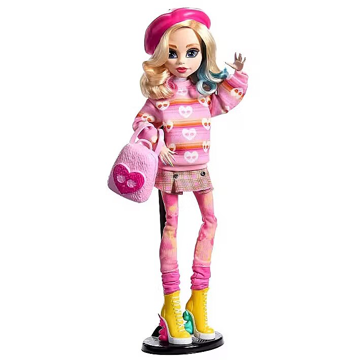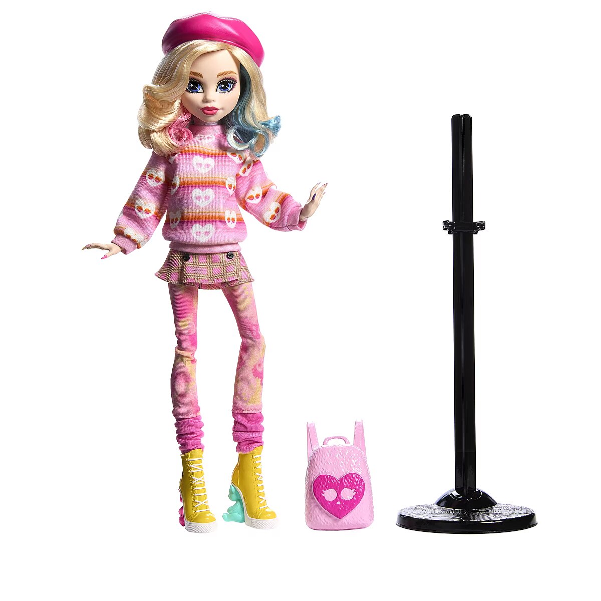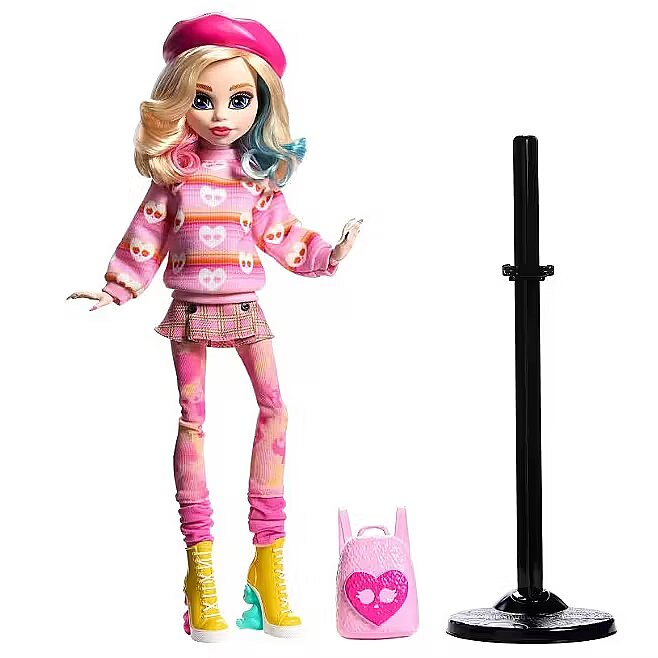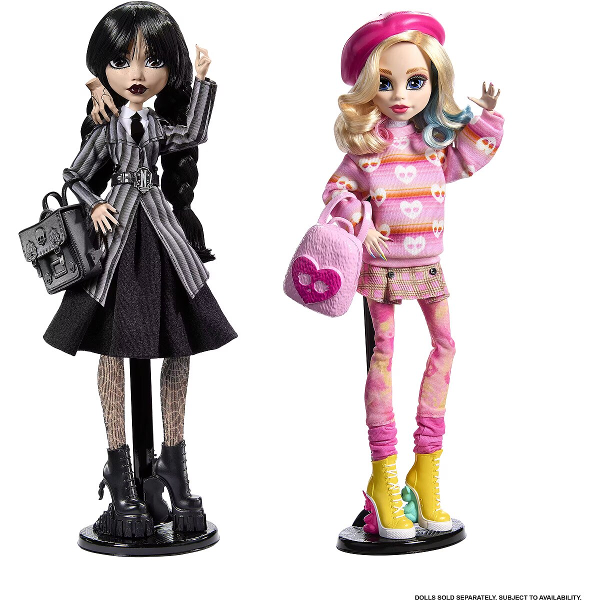 LongDesc - The minds behind Monster High and Wednesday have collaborated to create a chillingly beautiful line of dolls inspired by the hit television series. Inspired by her character's bright and colourful style, this Enid Sinclair collectible doll looks iclawnic in an all-pink look featuring a beret and backpack accessories. As endearing in doll form as she is on the show, Enid is ready for anything -- whether it's getting the tea on school gossip or fighting off a homicidal monster! Doll cannot stand alone. Doll stand included. Colours and decorations may vary.