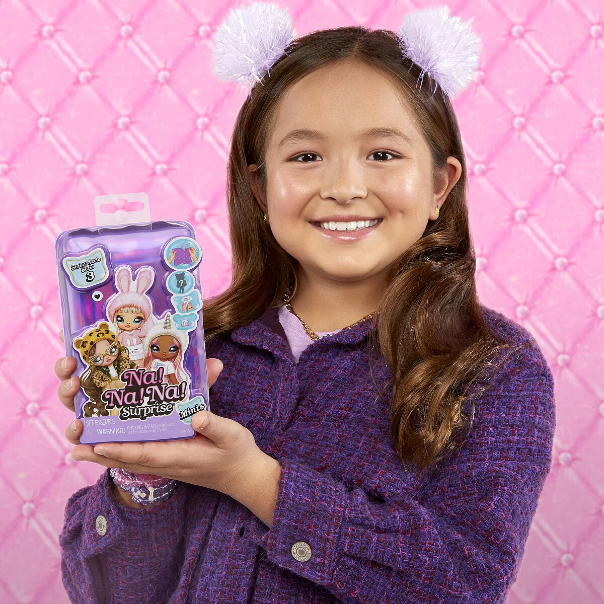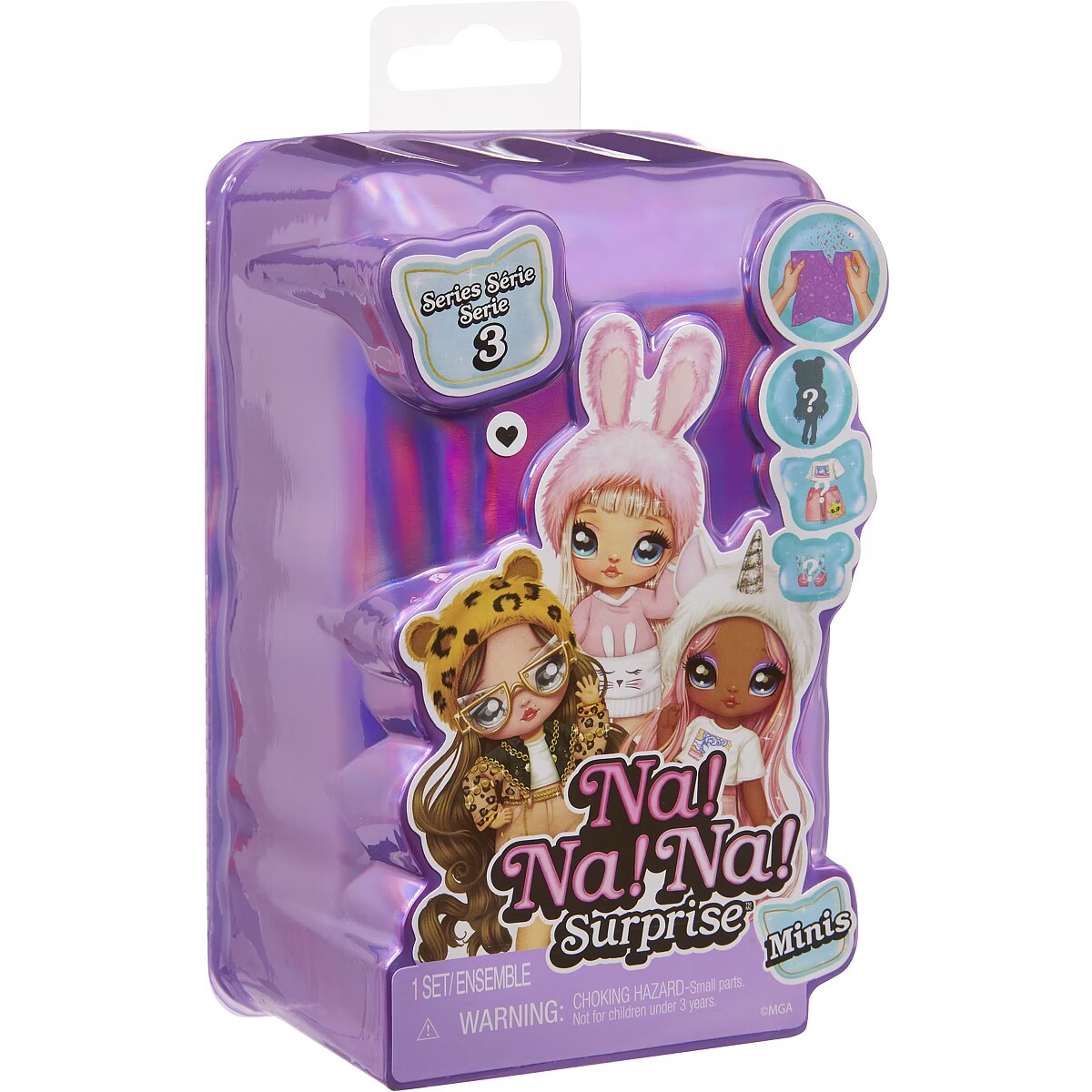 LongDesc - Collect your favorite Na! Na! Na! Surprise original characters in a brand new scale with the all new Na! Na! Na! Surprise Minis Series 3! You won't know which doll you got until you unbox them! Each doll has beautiful face details, rooted hair and adorable animal-inspired fashions that can be mixed and matched across all Na! Na! Na! Surprise Minis dolls. Included is 1 doll, 1 outfit and 1 pair of shoes. MAY CONTAIN: 1 pair of socks. Perfect size for a stocking stuffer, Easter basket or birthday gift bags! Collect all 12 Na Na Na Surprise Minis - Tuesday Meow, Cora Cowgirl, Jenny Jaguar, Mermaid, Panda Boy, Mimi Joyful, Aubrey Heart, Ari Prism, Catie Cat, Tiger Linda, Whitney Sparkles, Zara ZebraNa! Na! Na! Surprise fashion dolls and playsets are for collectors and kids – girls and boys 4 to 10 years old and up who are animal-inspired fashionistas that are big on friendship, fabulosity, and all things cozy, soft and fuzzy. From MGA Entertainment, creators of LOL Surprise fashion and collectible dolls, Rainbow High fashion dolls, Na Na Na Surprise fashion dolls, Bratz fashion dolls, MGA's Dream Ella fashion dolls, MGA's Glitter Babyz baby dolls, Lalaloopsy dolls, Baby Born Surprise baby dolls and collectibles, Little Tikes kids toys and many other favorite brands.