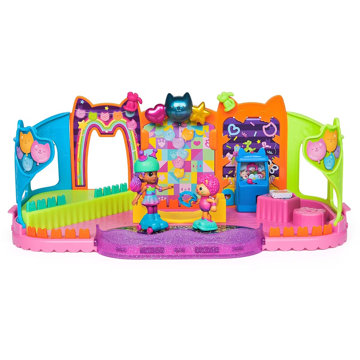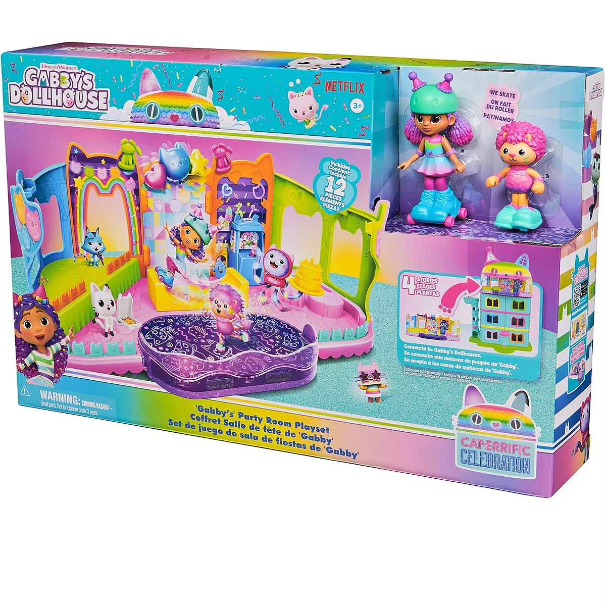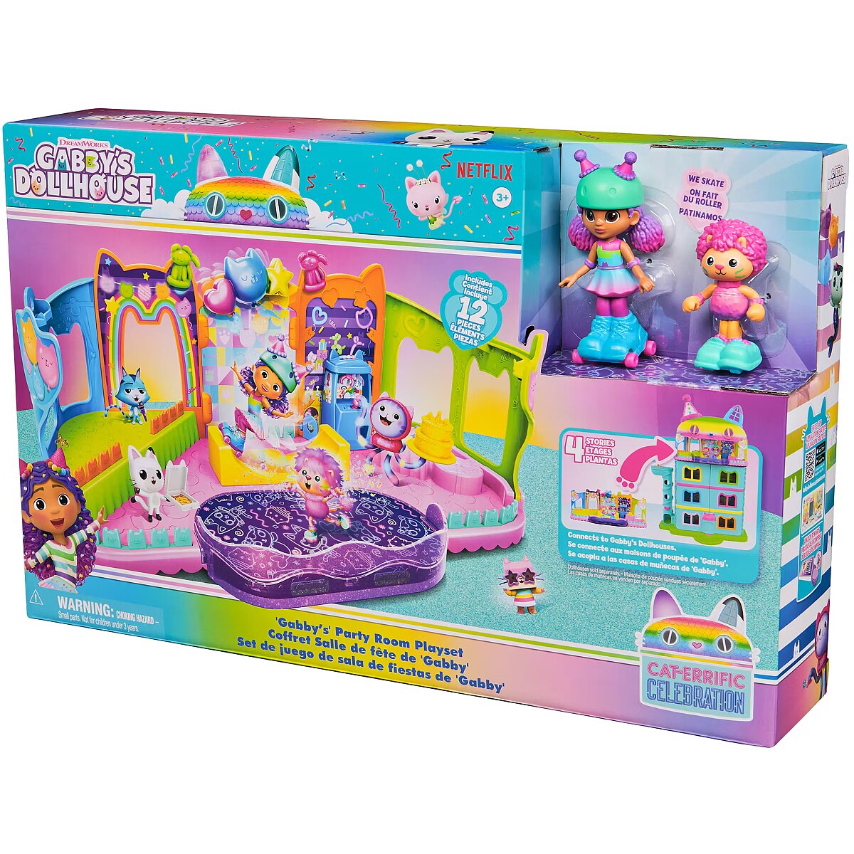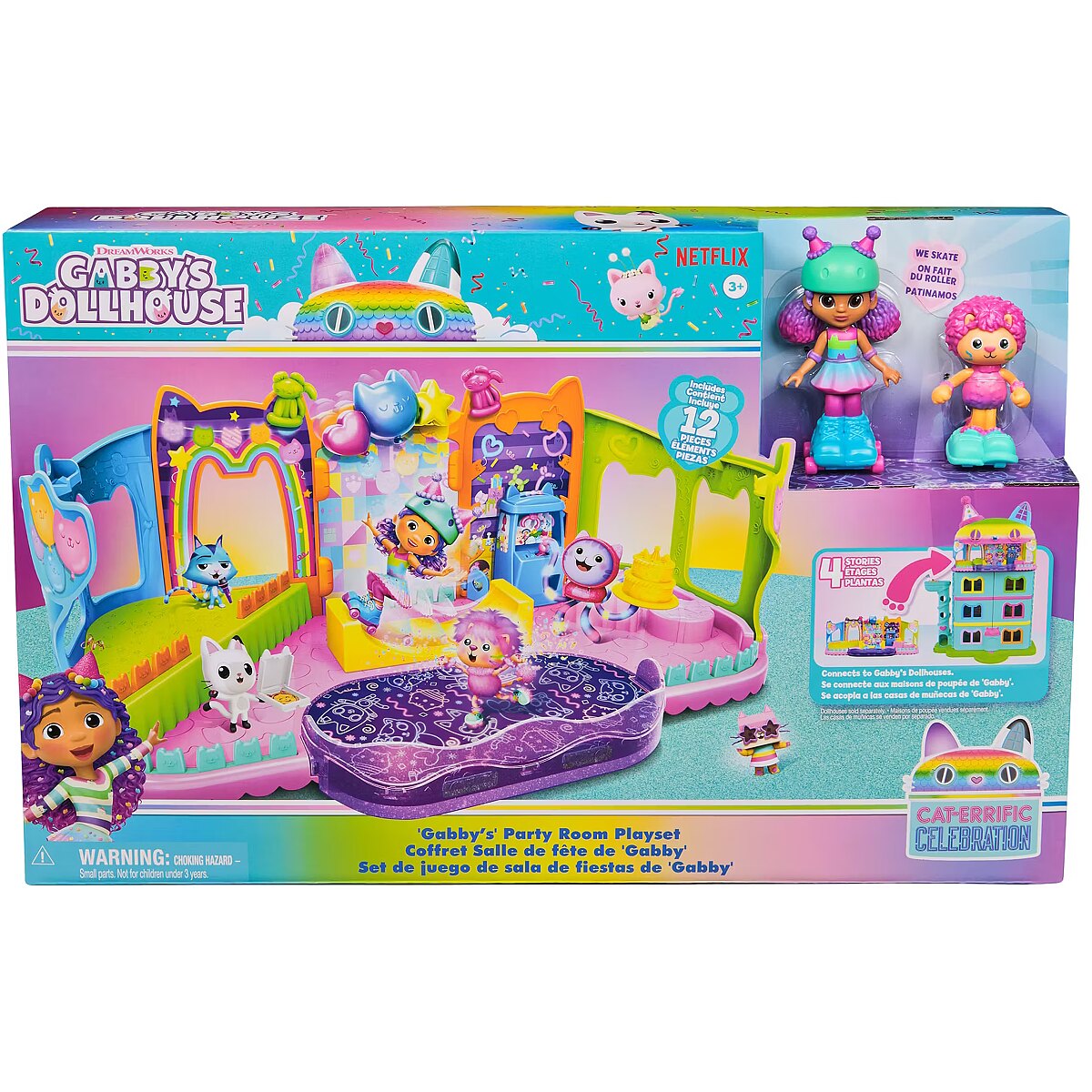 LongDesc - Step into the magical world of Gabby’s Dollhouse with Gabby’s Party Room Playset! This set includes exclusive 4-inch Skater Gabby and Skater Marty the Party Cat toy figures with working skates! Decorate the Party Room with dollhouse accessories & furniture, then enjoy sensory play with fidget toys on the Party Room wall! For even more fun, attach the Party Room to Gabby’s Dollhouse to raise the dollhouse up to 4-stories-tall and then access the party room with the doll house cat-a-vator! Gabby’s Dollhouse toys for girls & boys are great gifts for kids who are fans of the hit Netflix series and enjoy building pretend play doll house worlds. Make their entry into dollhouse play memorable with a world of lovable toy figures, dollhouse accessories and dollhouse furniture to collect and configure! Build your world with house kit essentials like a play kitchen or a music room, and tons of items to collect, like an awesome cruise ship toy, a mermaid themed pool and the all-new Party Room Playset - dollhouse attic with an indoor skate park, and super cute dollhouse balconies with mini fidget toys, that provide satisfying sensory play, and work seamlessly with both versions of the dollhouse!Includes: 1 Playset, 2 Figures, 8 Accessories, 1 Dollhouse Delivery