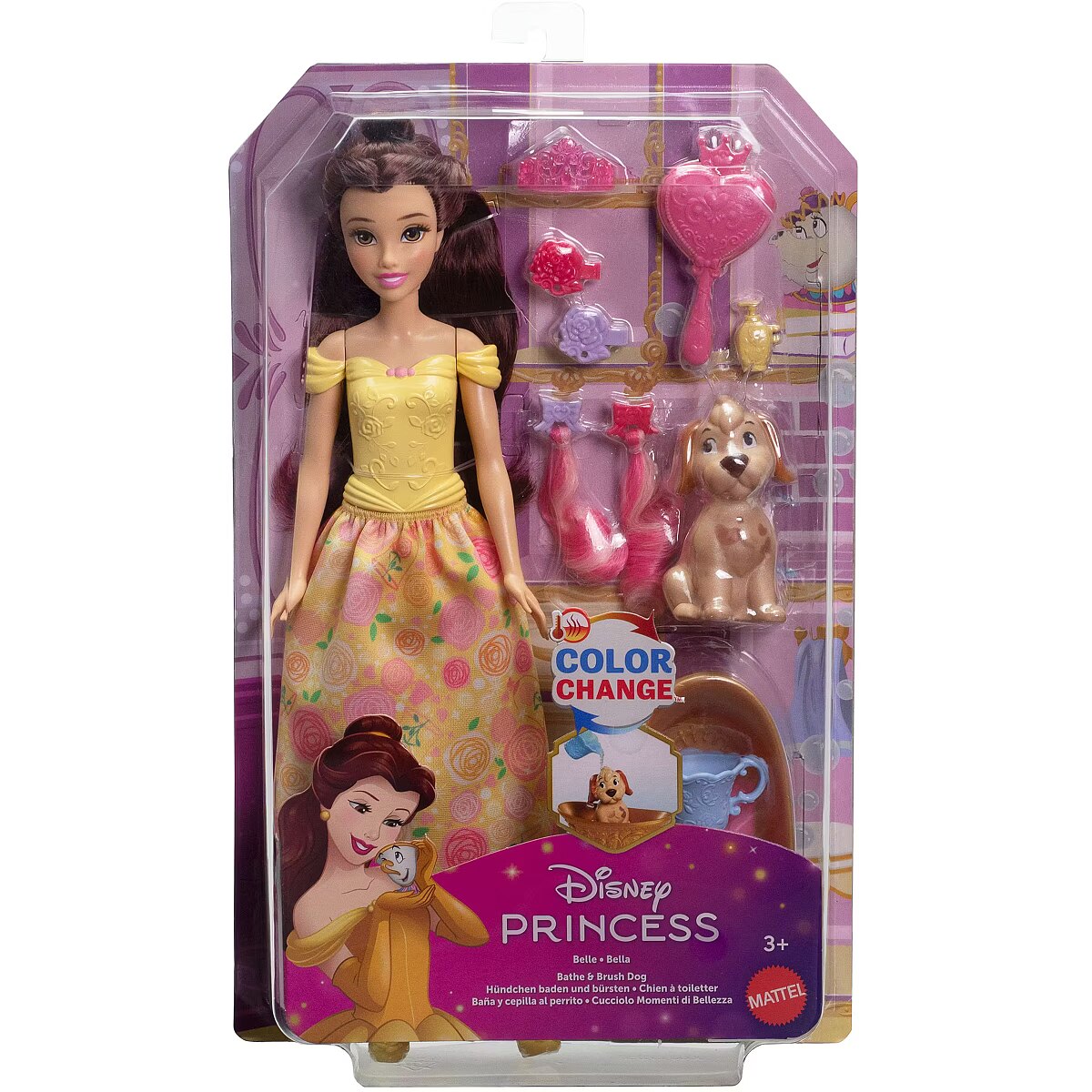 LongSummaryDescription - Disney Princess Bathe & Brush Belle Fashion Doll & Dog Figure with Color Change & Accessories. Doll type: Fashion doll, Doll's gender: Female, Recommended age (min): 3 yr(s). Height: 295 mm, Weight: 160 g. Material: Fabric, Plastic, Product colour: Multicolour