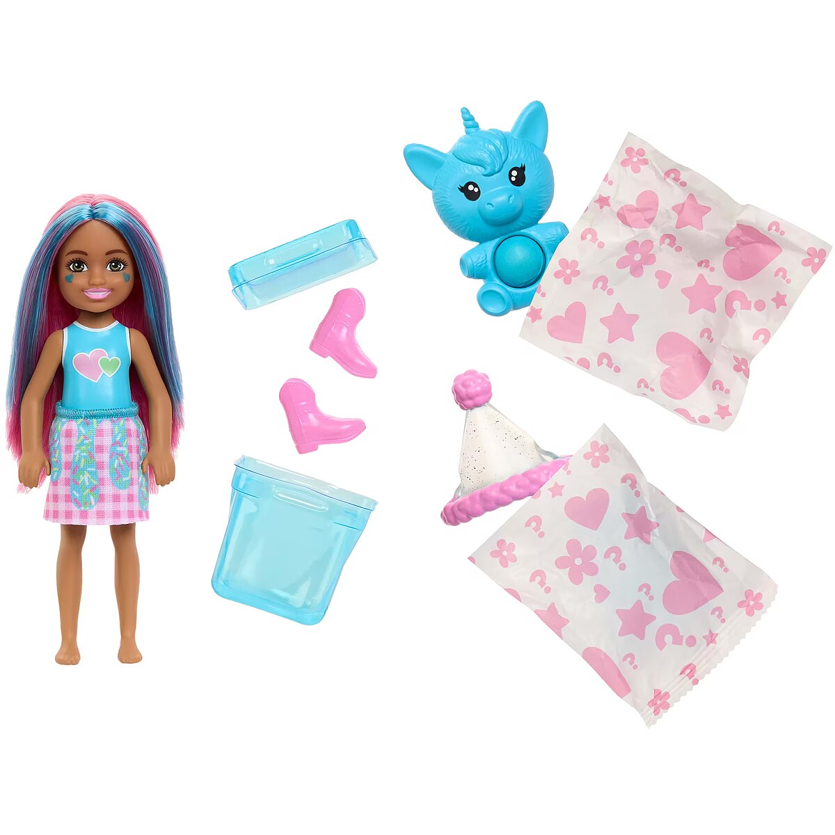 LongDesc - Barbie Chelsea Pop Reveal Shakes Series dolls offer a sensory opening experience with five surprises! Get the fun started by opening the milk carton-inspired box to find a scented Chelsea small doll. Which doll will you reveal? There's a Sweet Unicorn, Cute Kitten or Bright Bunny. Continue opening to find two mystery bags and an ice cube with a surprise inside -- pop it to discover a pair of shoes or boots! The ice cube is reusable -- repeat the pop reveal fun again and again. Mystery bags hold a skirt, a pop-it pet and a party hat for the pet to wear! Discover more wow with colour-change transformations on Chelsea doll's face. Kids will want to collect them all! Each doll sold separately, subject to availability. Dolls cannot stand alone. Colours and decorations may vary.