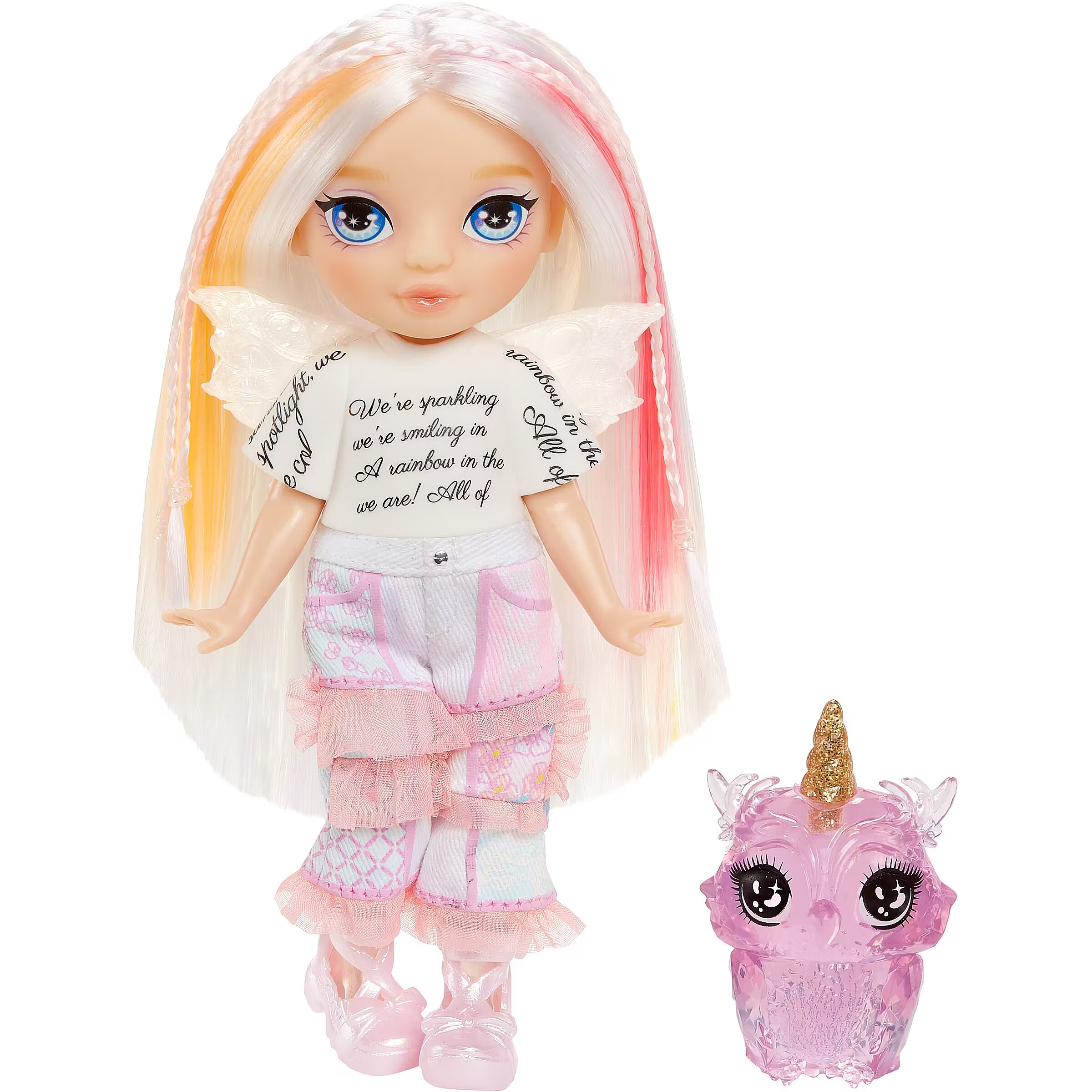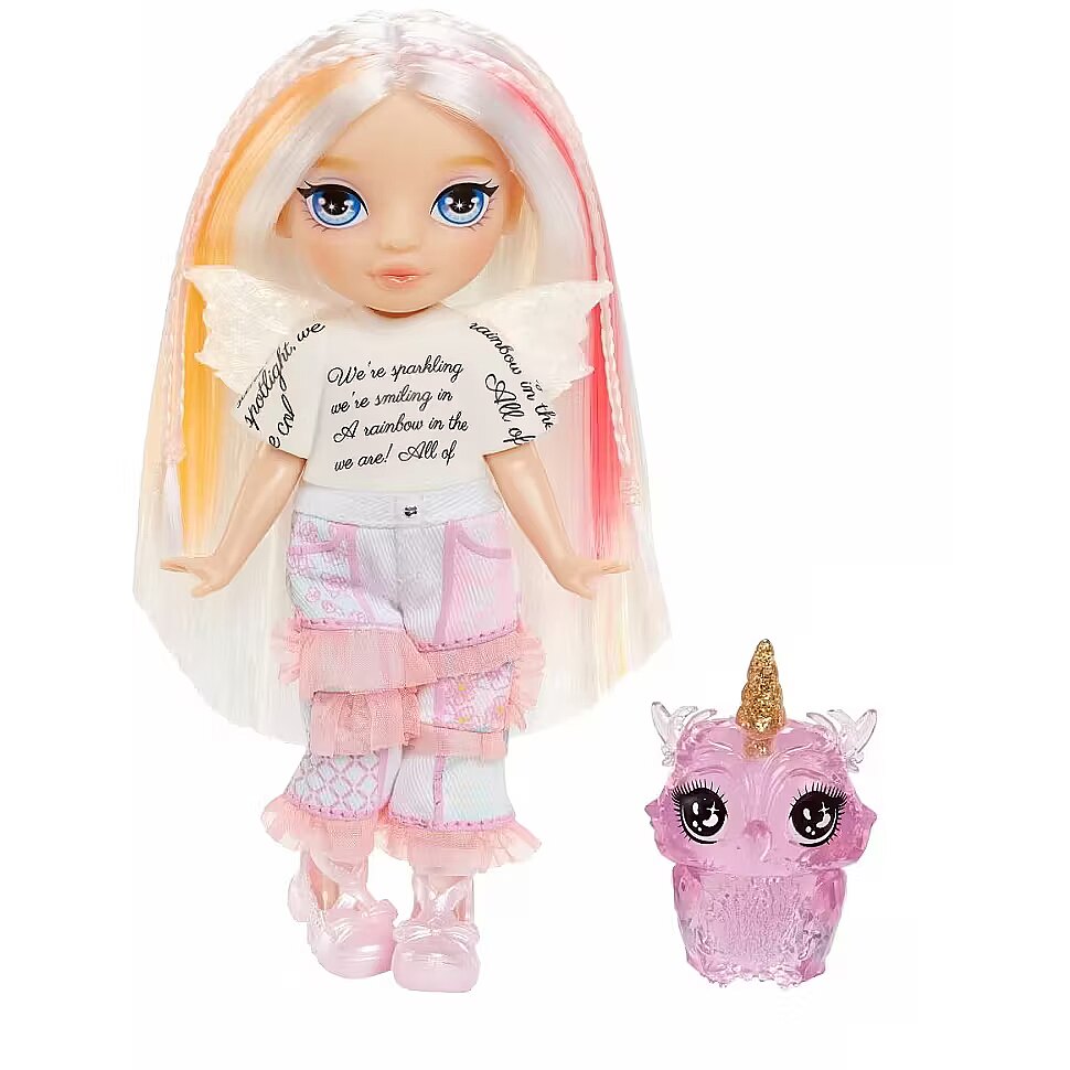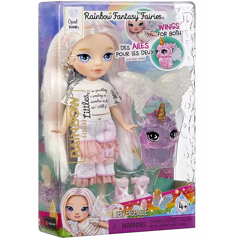 LongDesc - Rainbow High Littles are stepping into a magical world alongside their big sisters—and now, they have wings! These adorable Littles feature interchangeable fantasy fairy wings that can also be swapped with their enchanted pets. Each 5.5” poseable doll comes with a removable outfit, stylish shoes, brushable hair, and mesmerizing clear legs._x000D_Collect the rainbow: Astrid dazzles in rainbow with her Butterfly, Apple shines in red with her Deer, Emerald sparkles in green with her Dragon, Sapphire stuns in blue with her Dog, and Opal enchants in rainbow with her Owl.