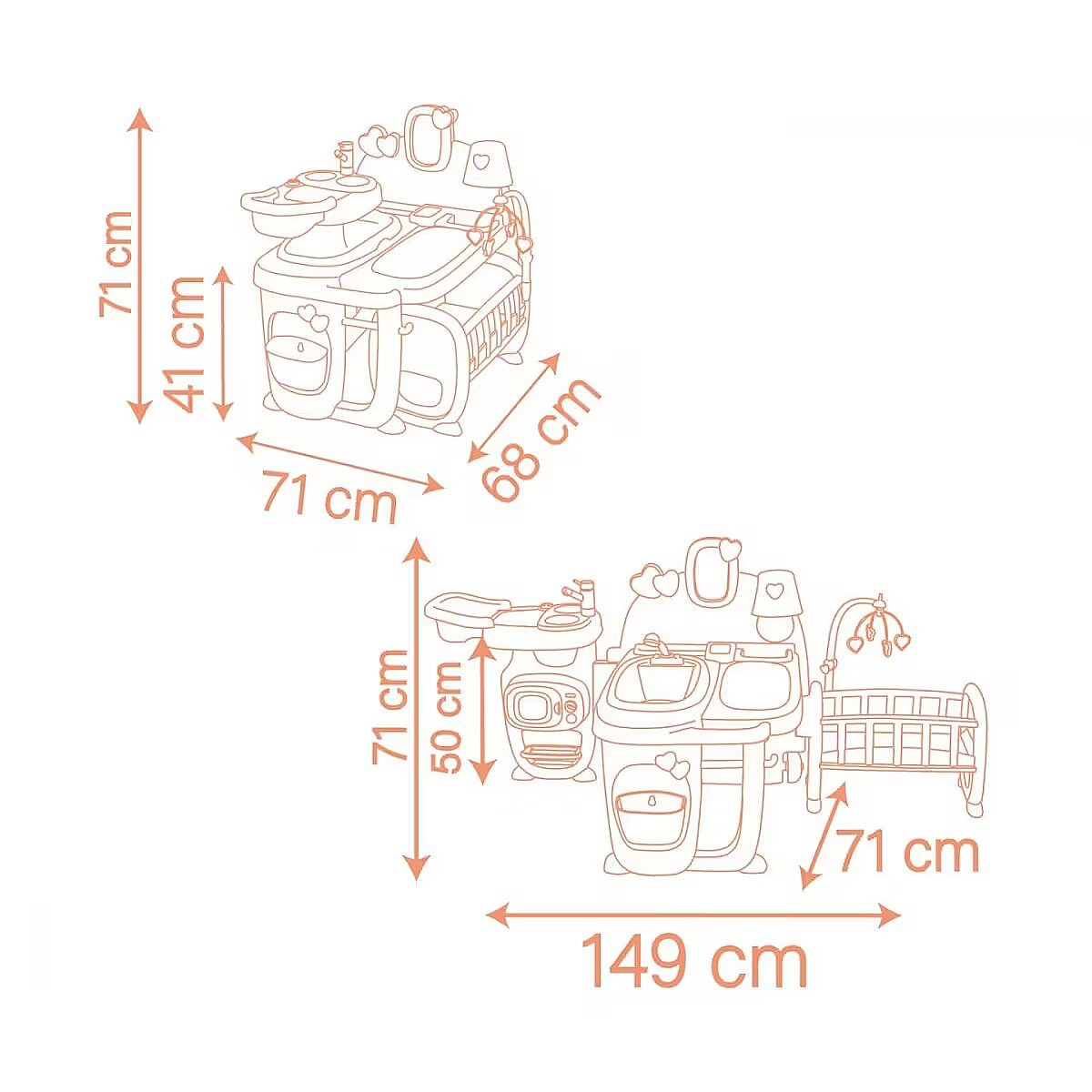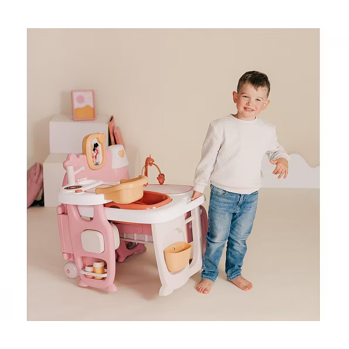 Description - Smoby Baby Nurse kącik opiekunki Składa się z trzech różnych obszarów: kuchni, łazienki i sypialni. Zestaw zawiera 19 akcesoriów, w tym: krzesełko, mikrofalówkę, zlewozmywak, garnek, wyjmowaną wanienkę, prysznic, przewijak, ramkę na zdjęcia, kołyskę z karuzelą oraz lampkę z kloszem świecącym w ciemności. Cały kącik można łatwo złożyć i przetransportować w inne miejsce. Dla lalek do 42 cm (brak lalki w zestawie). Do produkcji kącika wykorzystano plastik pochodzący z recyklingu. Wyprodukowano we Francji.