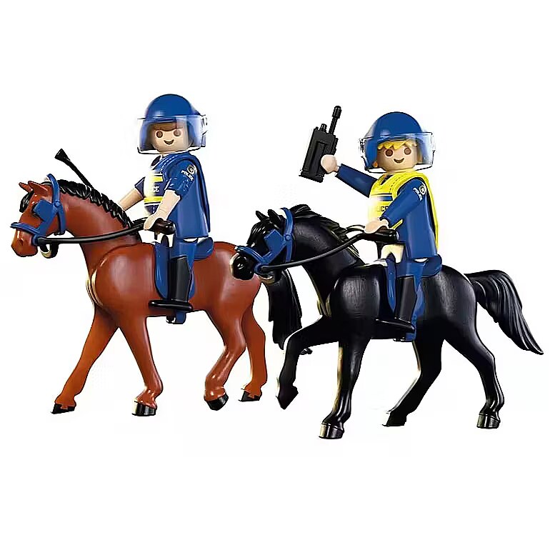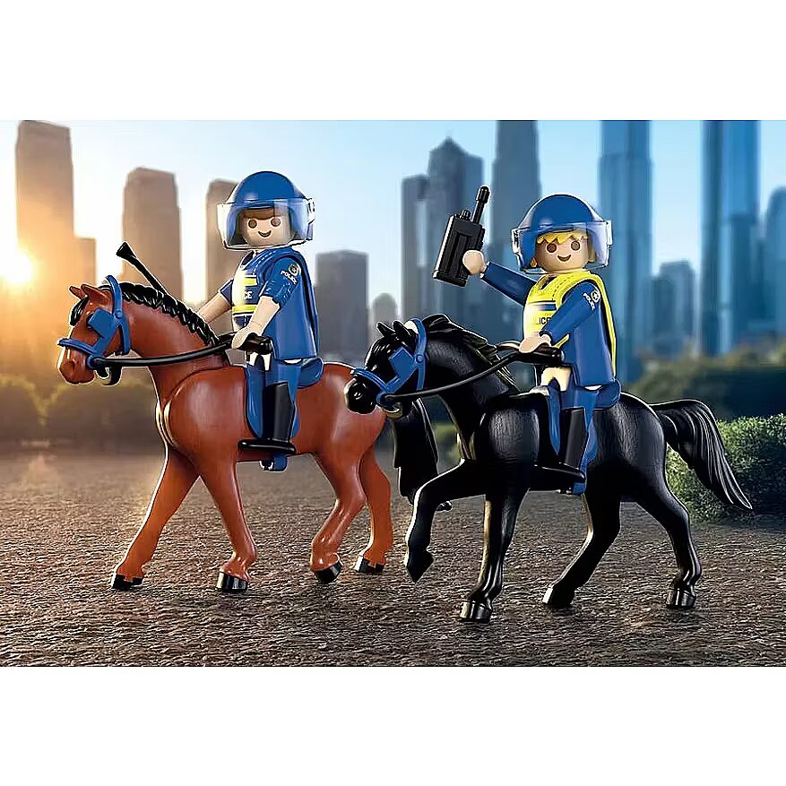 Description - Towarzysz dwójce policjantów podczas ich konnego patrolu przez miejską dżunglę i wspieraj ich w utrzymaniu prawa i porządku. Wyposażeni w sprzęt policyjny są gotowi do nagłych interwencji. Kopytka rozbrzmiewają w mieście - oto zestaw PLAYMOBIL: Konny patrol! Policjantka i policjant przemierzają ulice na swoich wiernych rumakach, gotowi do działania z radiem, latarką i zdejmowanymi kamizelkami. Konie są w pełni wyposażone w siodła i uzdy, a kaski funkcjonariuszy mają podnoszone osłony, które ułatwiają szybkie dowodzenie. Czy to w tłumie, czy w wąskich uliczkach - ten zestaw PLAYMOBIL to gwarancja emocjonujących przygód w mundurze. Idealny dla małych jeźdźców i przyszłych stróżów prawa!