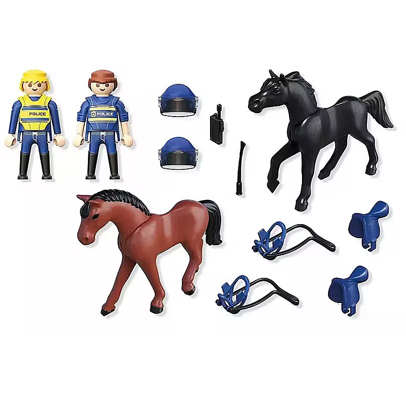 Accessories included - Figurki: 1 policjant, 1 policjantka Zwierzęta: 2 konie Akcesoria: 2 siodła i kantary, 2 palcaty jeździeckie, 1 radio, 1 latarka, 2 kamizelki policyjne, 2 hełmy policyjne z daszkiem