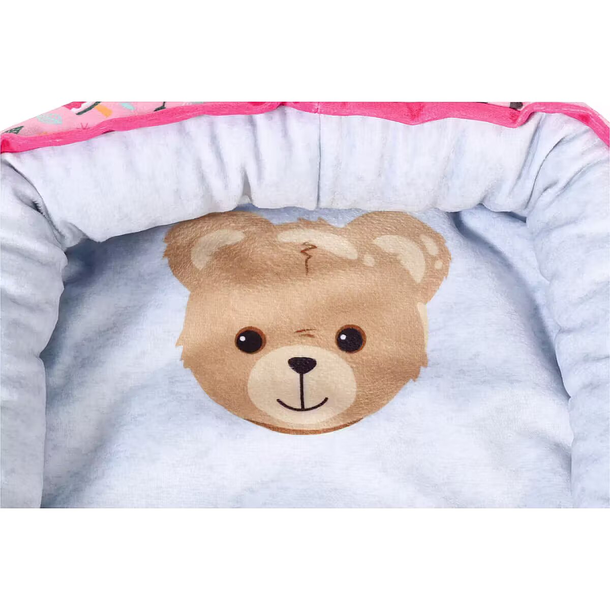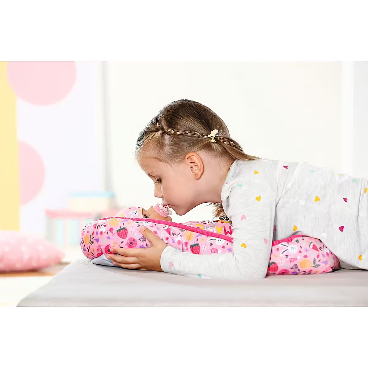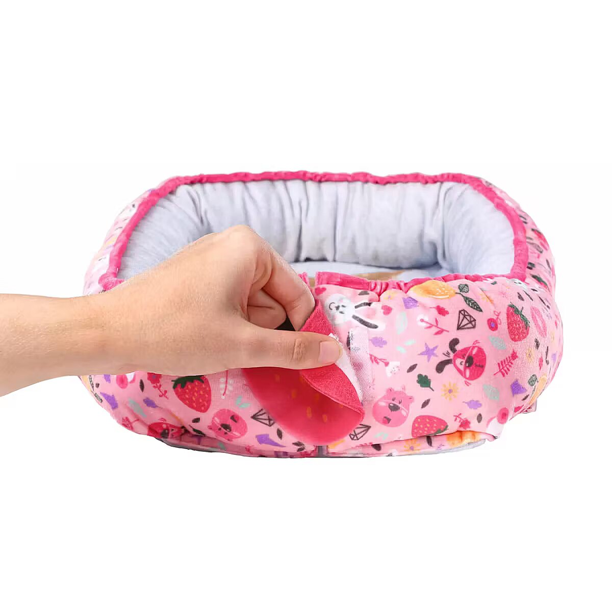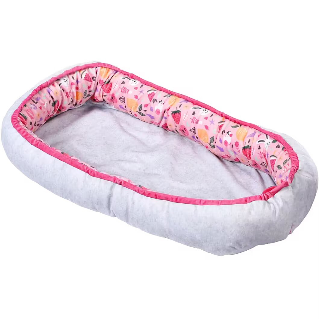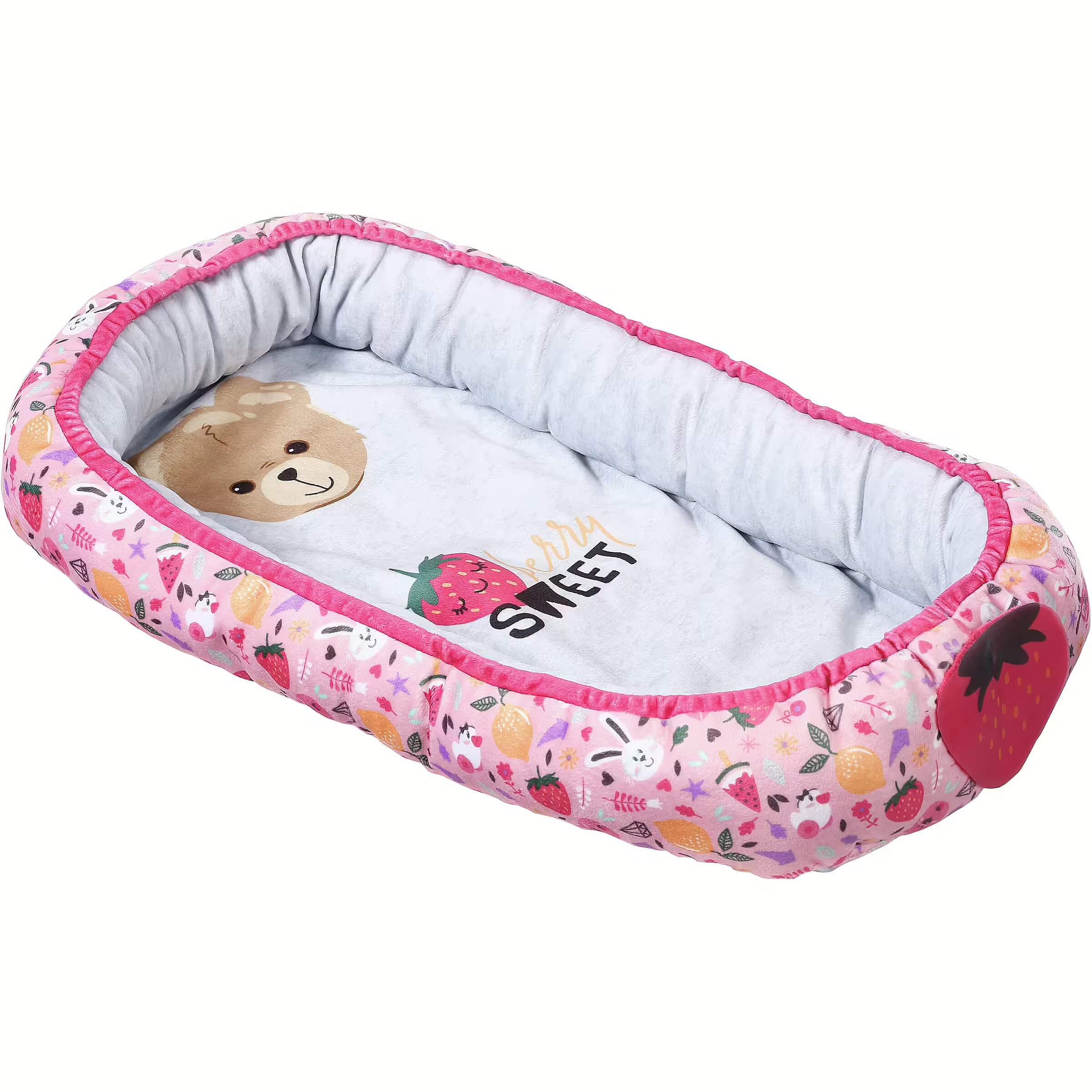 LongDesc - BABY born lies softly and comfortably everywhere in her baby nest. The colourful nest in a playful berry and bear design has a closable opening at the bottom so that BABY born can easily be taken out, put in and played with in the nest. Thanks to the soft padded edge, she is safe and cosy, whether on the sofa or on the floor in the nursery. Thanks to its reversible design, it can adapt to its surroundings and remains a varied accessory in the nursery.